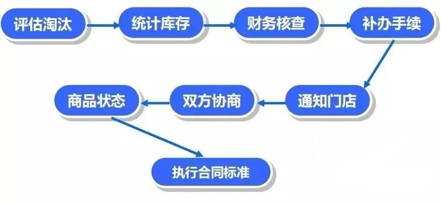 1、采购员根据供应商评估结果,填写供应商淘汰表,报处长签字审批;3、通知结算中心对供应商进行相关财务核查(供应商未结款、质保金),并停止结款;4、如供应商库存金额大于未结款项(不包含质保金),通知供应商到结算中心补交相关差额。5、在公共网上发布通知,停止进货,并通知各门店退货;7、转资讯部修改供应商商品状态及关闭供应商供应链。8、根据合同标准,(食品三个月、非食品18个月)到期后,供应商将质保金收据转业务员和处长签字,到结算中心领取质保金。![]()