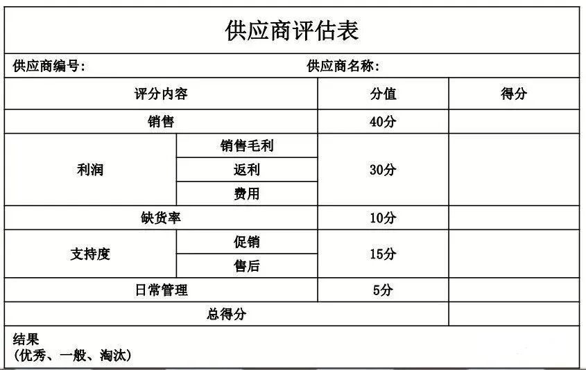 2、利润:根据本课供应商的平均毛利率制定供应商利润得分,满分30分;3、缺货率:根据各课制定的缺货率标准,评出供应商缺货率得分,满分10分;4、支持度:根据供应商促销和售后的支持力度,评出供应商支持得分,满分15分;5、日常管理:根据供应商日常合作情况,由业务员对供应商日常管理进行评分,满分5分。![]()