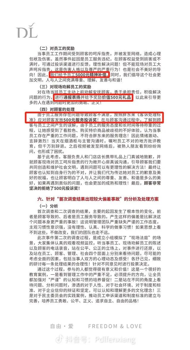 报告称,胖东来表示由于服务存在问题,管理人员全部降级3个月,并携礼物与500元服务投诉奖,上门为顾客致歉,事后顾客坚决拒绝了500元投诉奖。