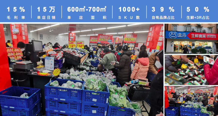 盒马生鲜奥莱,自有品牌占比达39%,单店日销15万单,1000多个SKU,生鲜+3R占比50%,毛利率15%。