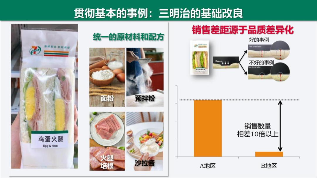 7-Eleven品牌进入日本是在1973年,今年正好迎来了50周年,50周年的发展可以分为四个时期:黎明期、成长期、变革期和新生期。黎明期(1973~1979),公司把普遍认为只有在家庭才能够制作的饭团、好炖等商品进行了开发,并且在工厂进行标准化生产,在店铺端进行销售。可以说,7-Eleven开创了以FF日配商品为核心的便利店模式的雏形。此外,还开启了商品共同配送的模式,引发了物流变革。成长期(1980~1999),率先导入店铺端的POS收银系统,同时开展代收代缴水电煤气费的公共服务,成为当时日本社会不可或缺的社会基础设施。变革期(2000~2009),进入21世纪之后率先推出了实体会员卡,以及打破了当时行业常规的认知,致力于高品质的自有品牌商品的开发。在这个时期实现了与科技共进步。新生期(2010~),最近十年,为了能够顺应更加多样化的顾客需求,推出如移动售货车,以方便老年消费群体,推出自动售货机业务,将便利带到更多地。这50年是7-Eleven不断创新、变革的50年。正是因为这种创新变革的品牌基因,虽然疫情发生之后,销售有一定的下滑,但是公司瞬时分析了当时消费者的行为、需求的变化并采取了相应的应对措施,使得店铺销售迅速恢复到了疫情前的水平。疫情三年期间,品牌在日本总体的销售额节节提升。疫情发生后,消费者居家的时间普遍变长,不能经常去餐厅用餐,对于美味和便利的需求更加强烈。针对这些需求,当时7-Eleven在商品政策方面有以下举措:第一,不断加强方便食品的研发,不断推出高品质的佐餐小菜商品;第二,大幅增加了微波加热即可马上食用的、价值感强的冷冻食品;第三,全新导入了一些水果、生肉等生鲜食品。通过种种举措,在商品层面满足顾客多样化的需求。7-Eleven在日本的成功,也促进了7-Eleven品牌在全球的发展。目前,7-Eleven品牌在全球有8万多家门店,下一个50周年,进一步大力发展全球市场,强化全球资源共享是集团非常重要的战略目标。在全球发展的目标中,战略核心还是以食为先,我们将充分发挥集团在供应链、商品研发上的差异化优势,一方面不断强化供应链,另一方面不断提升FF日配为核心的商品品质,同时继续扩大各种品类。从中国市场发展来看,除去港澳台地区以外,目前7-Eleven进驻了中国内地16个省级行政区,截止去年年底,7-Eleven在中国内地有3300多家门店。在三年疫情期间,7-Eleven店铺数得到了稳步增长。究其原因,则是7-Eleven一直以来坚持的商业模式:首先,以食为核心,这是7-Eleven的一个基本战略。以高品质的FF日配商品作为吸引顾客高频次到店的手段,提升单店销售额,帮助门店获得盈利。其次,在保证门店盈利和品质的前提下,扩大店铺的数量。三是,店铺数量实现一定规模之后,帮助供应链整体实现盈利。四是,通过进一步投资,包括设备投资,技术革新,从而进一步提升FF日配商品的品质。实际上,要跑通这条链路,需要我们坚持不变的方针并真正付诸于行动。我们认为有两个方针:应对变化和贯彻基本。这是不可或缺的两个部分,一味讲究标准不追求变化肯定不行,但过多追求变化而忽略了基本,变化本身也未必能够得到成功。以商品为例,中国各地的7-Eleven公司都采用了统一的商品政策,不断丰富商品种类,提升商品品质。在商品政策方面,FF日配为核心商品,供应链的保障不可或缺。我们结合各地7-Eleven公司的开店政策,在各地布局了供应链和工厂,同时对这些供应链工厂进行统一支援。统一支援包括初期的工厂建设或者设备投入,再到日常的生产管理,对于单品的统一原材料、统一配方方面也都有支援。现在在各地使用了统一原材料或配方的商品,占FF日配商品销售的比例已经高达76%,这个高比例也保证了我们的畅销品得以在各地迅速展开。当然,虽然支援是统一的,但是由于各地工厂对于标准的执行、流程的执行各有不一,这样就会导致我们工厂的水平不一,直接又体现到各地的商品品质也有不同。比如三明治产品。我到各地出差的时候,都会去确认鸡蛋火腿这款三明治,因为在三明治商品里,这款商品使用统一原材料和配方的程度是最高的。但是各地的商品呈现并不相同,在呈现好的地区,这款商品的面包非常松软,口感和现做的三明治没有差异。但是不好的地区,面包看着发干,嚼起来粘牙。商品品质的差异直接影响了销售数量,在销售最好和最差的地区,这款基础款商品的单店单天的销售数量相差可以达到10倍以上。针对品质的差异,7-Eleven中国会组建一个综合的支援团队,对各地的工厂进行全面的诊断,进行全程的线上支援或线下指导,希望以此消除各地的差异。同时对于基础方面的改良也在不断进行。再看外卖系统升级的助力和贯彻基本的关系。2022年8、9月份的时候,我们对外卖系统进行了升级。即使是在系统升级之前,对外卖基本的必要工作贯彻力度很高的区域,外卖订单数量就高于贯彻不到位的地区,系统升级后外卖订单得到了进一步提升,反之基础工作贯彻不到位的地区系统升级后的助力效果并不大。自助收银也是一样。现在自助收银的顾客使用率超过50%,根据估测减缓了16%左右的店铺人工。对这部分人工,如果我们不去给店铺明确规定,在空出的时间,在高峰前、高峰时、高峰后做什么,那么这个效果就只会停留在理论上,未必能够真正改善店铺服务,甚至提升店铺的销售。可以说,数字化或者技术的进步,是便利店未来发展的
