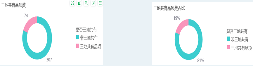 本期三地top200榜单单品共381个单品,其中三地榜单相同单品共74品,占比19.4%。