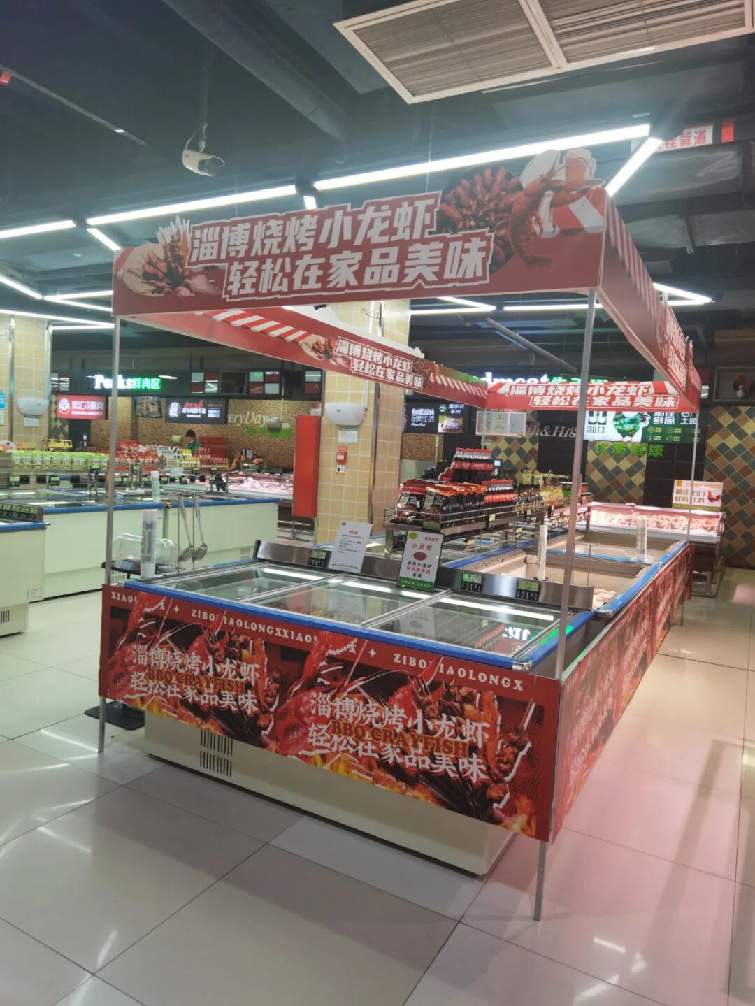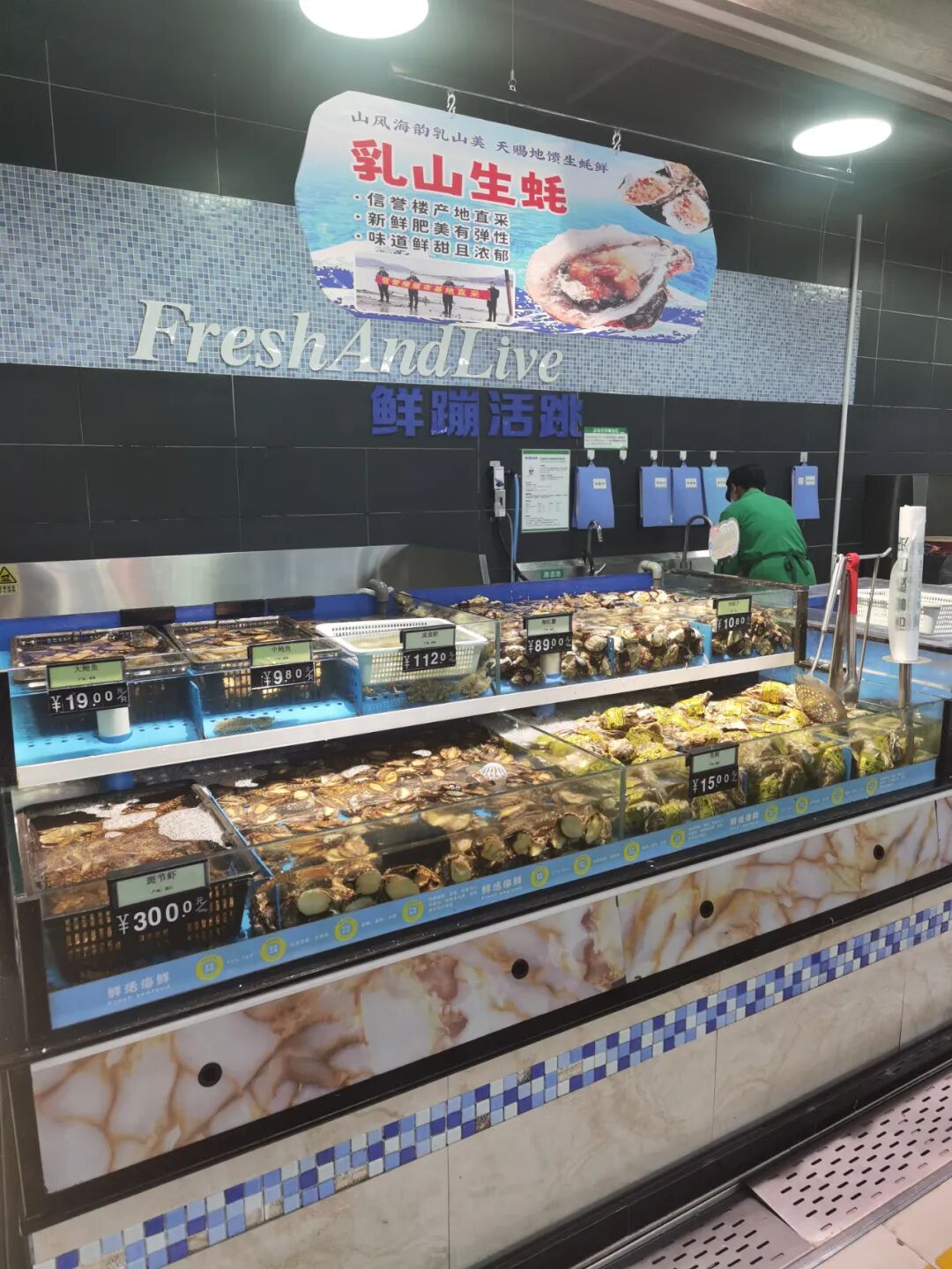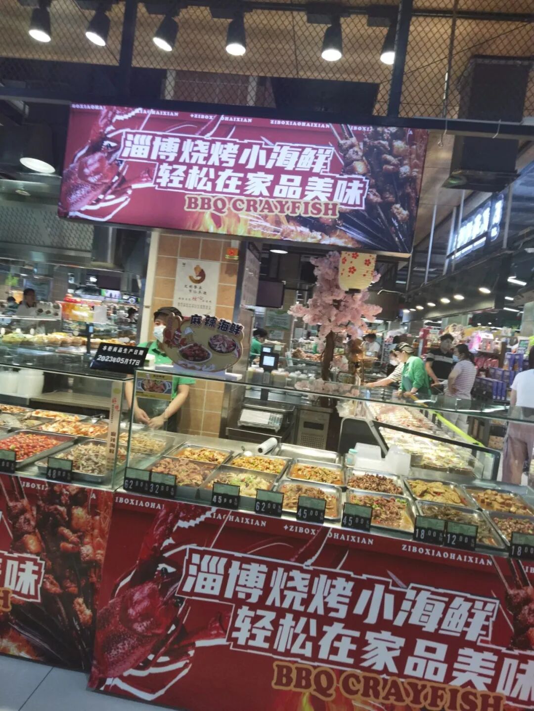 水产板块,在信誉楼系统内,桓台店也做到了销售额第一,日销近7万元,走的策略是以季节性、走俏单品带动其它单品销售的策略,同时确保新鲜度。比如,前段时间淄博烧烤很火热,所以信誉楼桓台店就把小龙虾单独拎出来做了一个很大的排面。