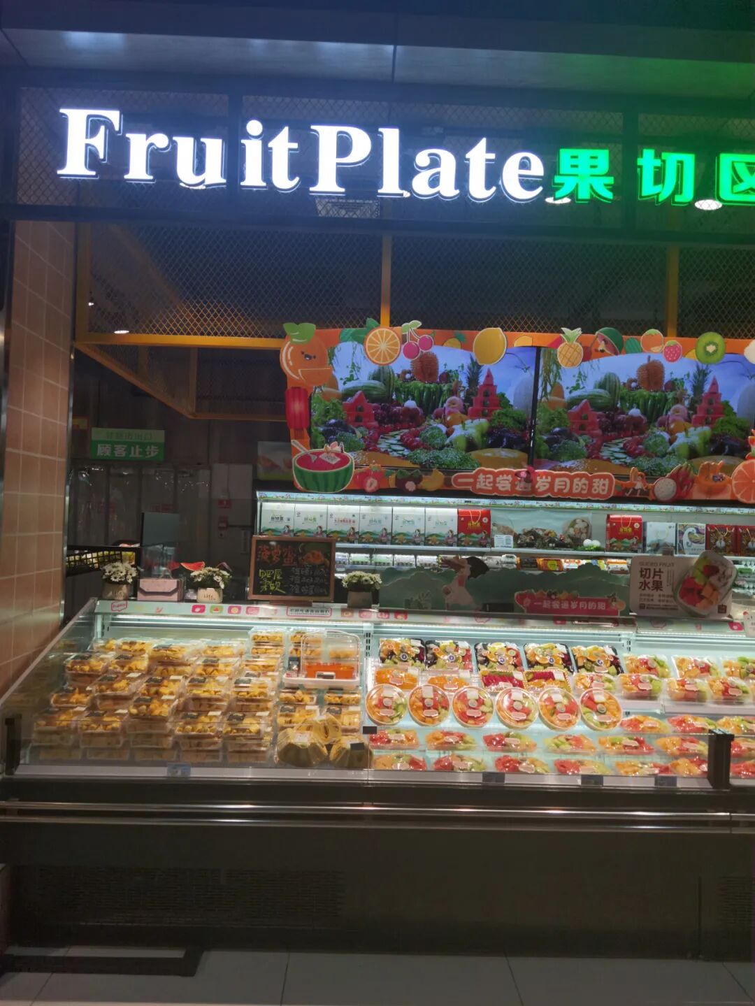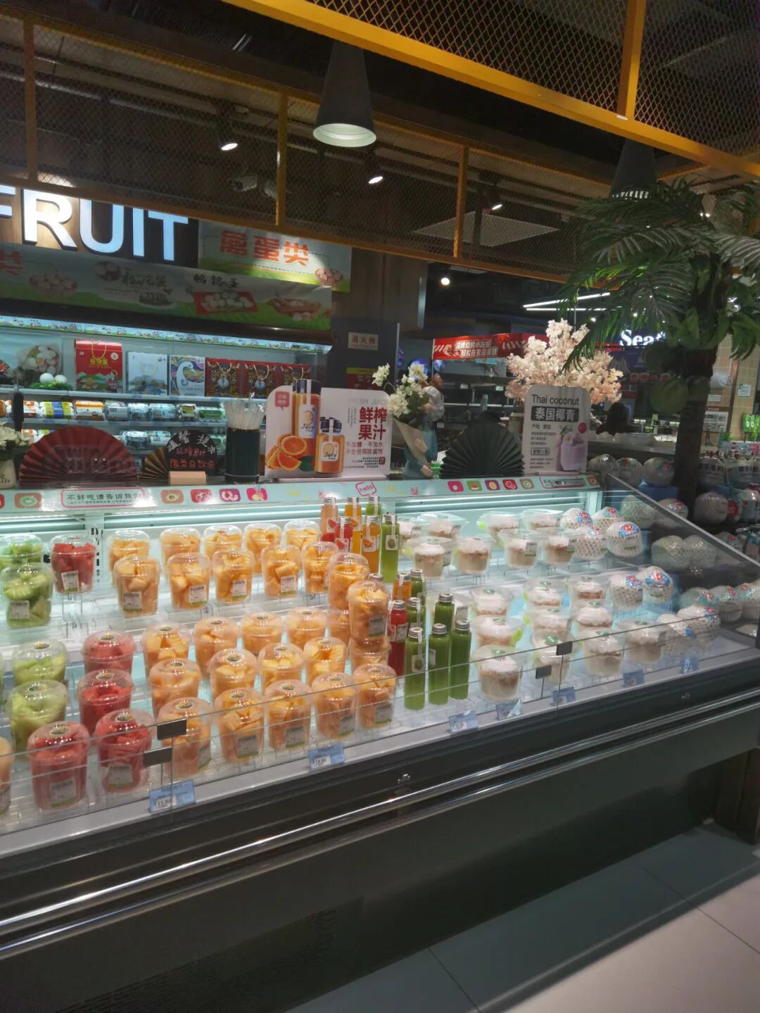 桓台店果切品做得相当丰富,有16个左右SKU,既有果切拼盘,也有各类水果榨汁。套用上述业内人士的话说就是“几乎能想到的果切、榨汁都有了”。比如当下时令水果荔枝汁、西瓜汁、山竹汁,以及常规果品苹果汁、瓜类切片拼盘。果切品陈列面积在2平米左右,也就是一个低温冷柜,一天销售在2万多元。