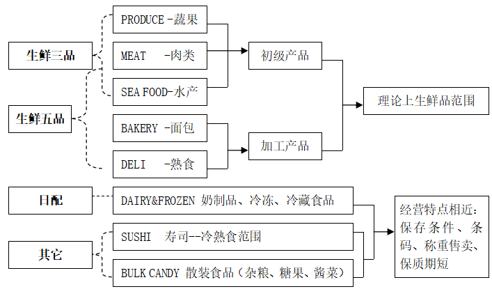 一、生鲜商品定义和经营范围1、生鲜商品定义生鲜商品按照加工程度和保存方式不同,包括初级生鲜商品、冷冻冷藏生鲜商品和加工生鲜商品三大