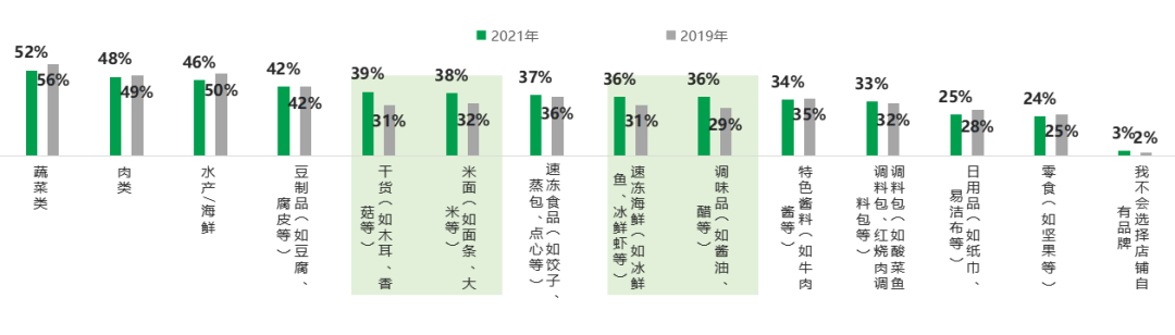 但往往现在超市做自有品牌,更多选择的是百货、零食、干货等,考虑到的是一保质期比较长,二不容易坏,三利润比较高。但根据消费者调研会发现,这些品类的自有品牌并不是最受消费者欢迎的,接受度高的反而是蔬菜这类生鲜品。首先,看一下蔬菜,消费者购买预包装蔬菜的原因是什么?消费者为什么会喜欢你包起来的菜?一是要确保种植全流程安全无污染,二是农家菜,三是有更多规格可以选择,要把这几点传达给消费者。其次是肉,顾客最希望看到的是安全无激素,还有品牌肉和精品肉,所以要跟消费者更多强调的是安全,无隔夜肉,生产时间消费者也很关注。我们去年年初的调研结果显示,有6%-7%的顾客购买生鲜传奇的自有品牌,这个比例每年都在提高。现在自有品牌和自制商品已经超过我们品种的一半,有1000多种,销售额也占我们的一半,而且认可度相当高,像豆制品、包子和馒头,消费者找着买。开发自有品牌,大家会发现你认为的和你实际调研的差别会很大。消费者最认可我们的豆制品,接下来是干货、米面、速冻海鲜、调味品,较2019年也有很大的提升。我们每年都有做调研,因为疫情,2021年没做,2022年我们做了一次。