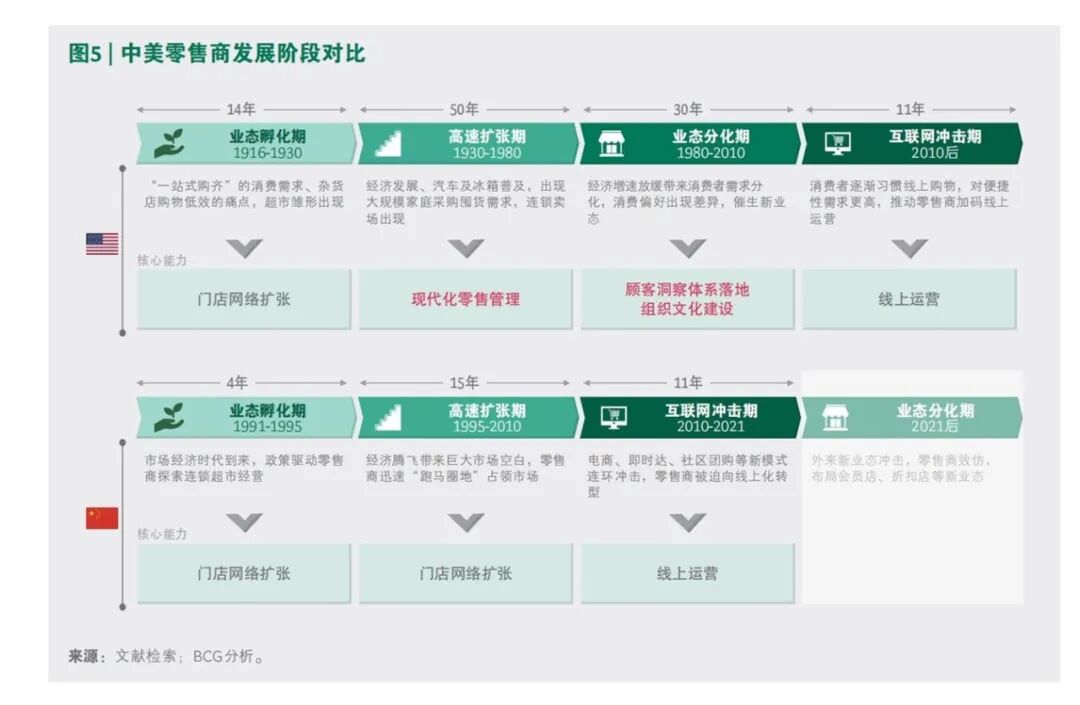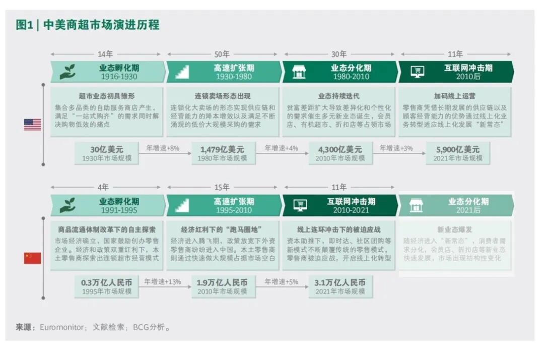 事实上,去年12月,中国连锁经营协会联合BCG波士顿咨询发布了《区域零售研究报告:打造中国“人本主义零售”》(以下简称“区域零售研究报告”),该报告对比中美商超市场发展历程,演进过程,展现了中美零售商能力发展的差异,为商超企业的内涵式发展之路,提供了可参照的方法论和样本。