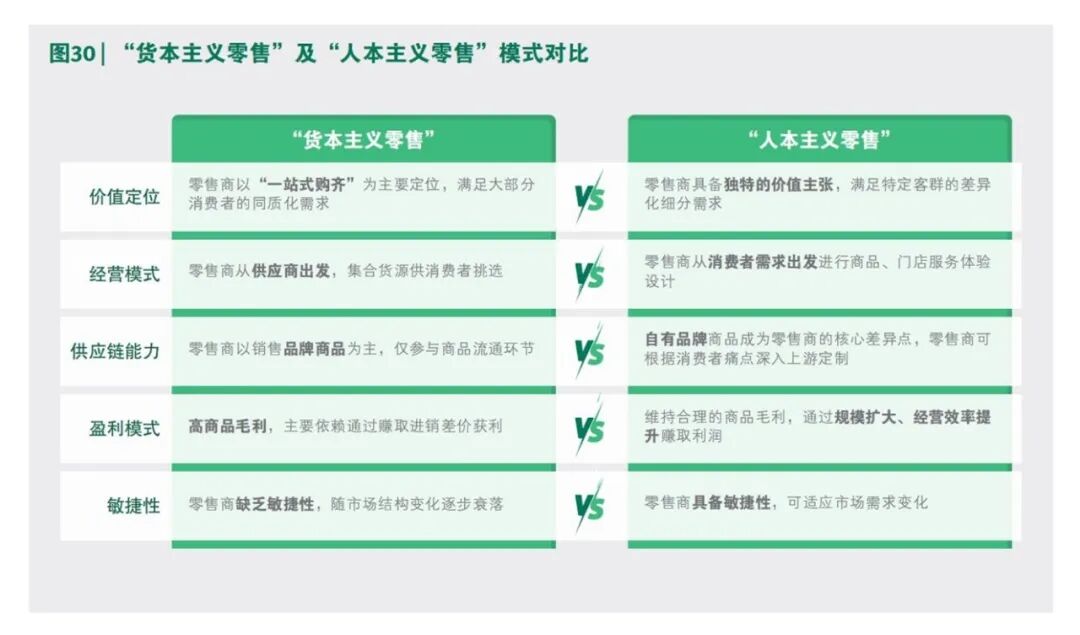 区域零售研究报告通过对比中美商超市场发展历程,演进过程,总结了过去30年,中国零售企业在“现代化零售管理、顾客洞察体系落地、组织文化建设”上缺失的关键“三堂课”,并提出了解决之道。报告研究认为,美国商超市场经历百年发展,在消费者需求逐渐分化和同业竞争过程中,零售商能力不断“进化”,在四个阶段分别打造了赖以生存的零售核心能力。例如,在业态孵化期,美国零售商在传统杂货店的基础上探索出了卖场模式必备的基本要素。在50年的高速扩张期中,零售商在竞争和整合中完成了对精益运营和效率的零售基础内功修炼。在业态分化期,为应对顾客需求的变化,美国零售商在迭代和试错中构建了以顾客为中心、零售品牌化的“护城河”,部分零售商实现了让消费者从大品牌忠诚到对渠道忠诚的转变。在这一时期,会员店、有机超市、折扣店等新业态纷纷涌现。这些新业态零售商通过准确定义消费者需求、深入上游供应链定制开发,开拓了丰富的自有品牌商品池,巩固了与传统卖场的差异化定位,从而取代“一站式购齐”的卖场业态,成为市场的主要增量。与此同时,区域零售商纷纷对卖场开启本地化转型升级,以抵御市场竞争。为防止核心人才外流,零售商们还开启组织文化建设,以形成转型的“自驱力”。正是这些“护城河”的建立,使得美国零售商可更从容地迎接互联网冲击期,通过数字化能力建设进一步升级零售内功,开启全渠道经营时代。而中国实体零售短短三十年从“跑马圈地”时代,直接跃入了全球范围内最猛烈的线上渗透。新零售、新模式、新业态在资本加持下叠出不穷。中国商超行业发展高速“快进”之下,由于“现代化零售管理、顾客洞察体系落地、组织文化建设”三项核心能力的缺失,难以在高速变化的市场中及时做出有效调整。报告研究认为,传统以集货为主的经营模式已无法适应新时代下的消费者。美国等其他国家零售商在进入业态分化期时,已夯实了零售核心能力基础,从“货本主义”走向“人本主义”。中国经济新常态下,零售商也亦亟需完成从“货本主义”向“人本主义”的转型。即从消费者出发,为其提供差异化商品及服务体验的零售模式,零售商主要通过规模化扩张下的经营效率提升获利,精准顾客洞察及稳定客流的掌控是其核心资源。基于此,报告总结了是从“货本主义”到“人本主义”的转型之道。一是,源于人(of the people)—顾客洞察实体化:源于顾客洞察,将需求系统性地转化为差异化商品和服务的能力。以美国、英国为例,精准定位目标客群、实现“零售品牌化”的零售商在过去10年中的增速均高于市场平均水平。二是,惠于人(for the people)—精益管理现代化:打造流程体系,在价值链上的各环节增效降本,将价值回归顾客的能力。报告认为,现代化零售管理不仅是数字化,更是端到端的流程重塑:端到端数据透明性、高效“人机结合”、全流程重塑。以商品管理为例,全球领先零售商多已实现“统采分销”的集约化管理模式,由中央采购组织追踪商品数据表现、由前线业务人员补充市场洞察,系统性落实“千店千面”。这种兼顾规模效率及顾客体验的经营模式,使零售商可摆脱人员管理宽幅的限制,实现规模化复制。三是,成于人(by the people)—组织文化自驱化:重塑企业文化、雇主品牌、和人才梯队,形成敏捷开放、内在自驱的变革土壤。报告提出,组织文化建设建设需把握三个要诀:保持企业“文化初心”、适应业务需求的组织架构调整,以及注重“雇主品牌”建设。未来,中国商超企业,面临的是消费需求多样化、更有个性主张的消费者。企业需要回归本质,以消费者为核心,从围绕“货”的集合全面转向围绕“人”的经营,不断满足消费者对美好生活的需求。
