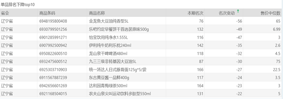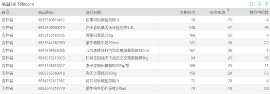 百事可乐碳酸饮料1L 下降75名,为本期下降最严重的单品。