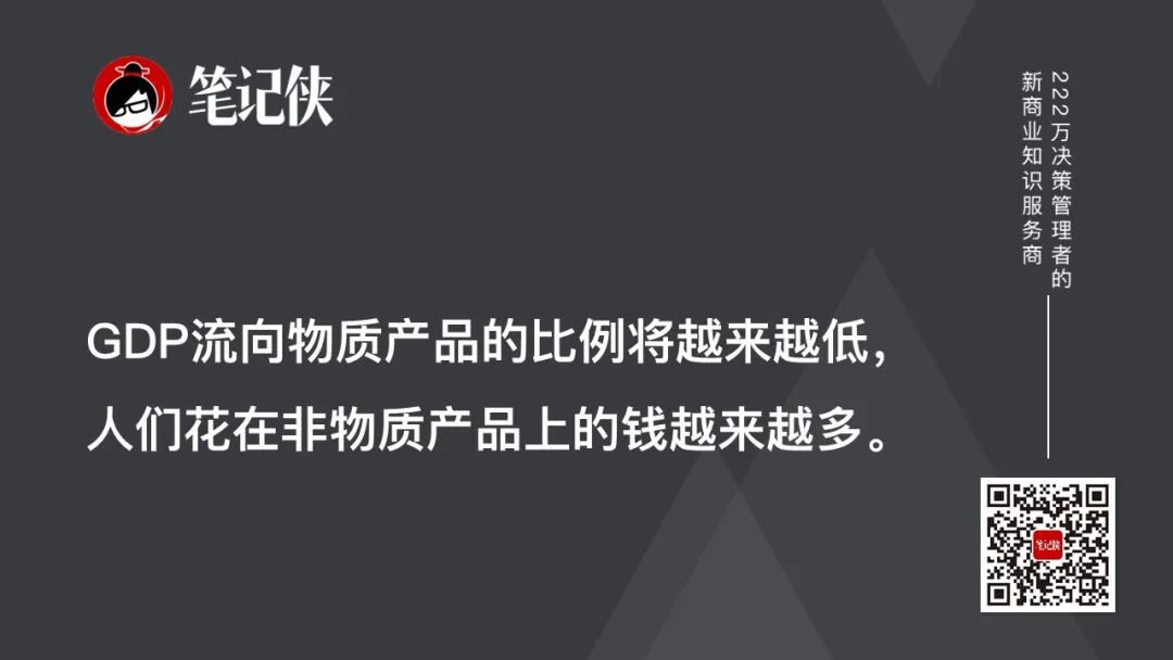 这也意味着,GDP流向物质产品的比例将越来越低,人们花在非物质产品上的钱越来越多。