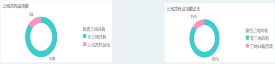 本期三地top200榜单单品共396个单品,其中三地榜单相同单品共58品,占比14.6%。