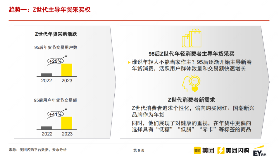 年轻人带动下,人们越来越习惯在“即时零售”平台下单,享受即买即得的购物体验。2月8日发布的《新春消费趋势洞察报告》显示,始于去年12月8日的美团闪购年货节期间,参与的连锁商超、便利商家数量同比增长36.9%,年货节超市便利订单量同比增长135%。龙商网超市周刊了解到,入驻美团闪购的华润万家、大统华、罗森、美宜佳等连锁商家,均取得了不错成绩。这得益于越来越多的年轻人成为年货消费的主导人群,连锁商超、便利店则通过即时零售平台更好满足年轻人的需求,赢得了增量市场。01