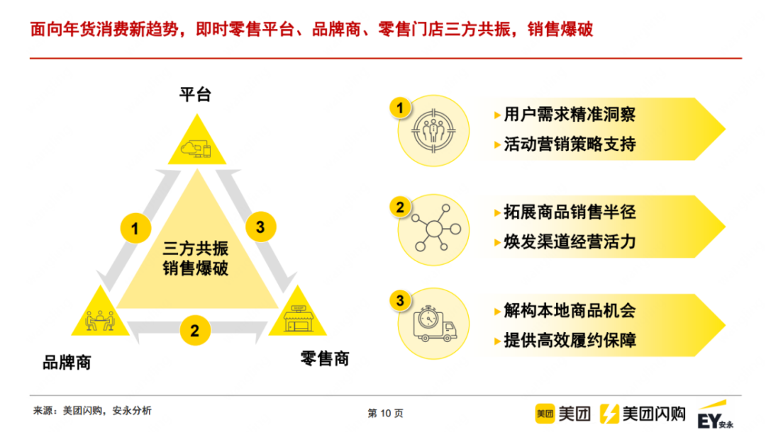 不同于传统电商,即时零售在线上、线下融合上发挥着独特价值。过去,电商企业与传统商超、便利店企业线上线下泾渭分明,尤其传统实体店很难切分线上的市场份额,只能眼睁睁看着原本属于自己的市场蛋糕被电商企业切分。但随着线上消费市场成熟,即时零售,很大程度上已成为以商超、便利店为代表的传统实体店低成本切入线上市场的最为务实、靠谱的模式。一是,即时零售延展了实体门店的增量经营空间,把门店的服务用户范围通过借助平台的履约基建,提升至3-5公里,实现30分钟送货到家。二是,即时零售本质上是线上赋能平台与实体门店两种互补商业模式的“和谐共赢”。比如,美团闪购,其核心竞争力在于依托美团体系分布于全国的6.9亿优质活跃用户,是一个普惠消费行业的平台,本身不会与传统实体店商家产生同质化竞争;并且美团闪购的业务,始终围绕的是服务实体商家的交易、履约展开。三是,即时零售基于本地化经营的特征,能够加深品牌商和零售商的合作,共同打造商品竞争力。以美团闪购今年年货节为例,引入了金龙鱼品牌方资源,联合商家渠道共同打造爆品,小年期间(1月13日-1月15日),金龙鱼销售额同比增长85%,其中重点渠道的表现如永辉超市、华润万家均增长超100%。目前看,诸如华润万家、美宜佳这样的全国型连锁商家早已成为即时零售的深耕者,事实上,即时零售“本地供给+即时配送”的模式,也天然适合区域型商超、便利店开展线上生意,借力美团的海量骑手和成熟的配送系统,加速渗透本地市场。“30分钟买万物”已成为新的消费习惯和生活方式选择,刷新着零售行业的“速度与激情”。公开数据显示,2021、2022年国内即时零售交易额分别为2275亿元、3530亿元,2023年将达5373亿元。而从目前以赋能实体店为核心价值的即时零售平台看,美团生态下的美团闪购,更值得实体店信赖。扫描以下二维码获取美团闪购联合安永咨询发布的《2023新春消费趋势洞察报告》![]()