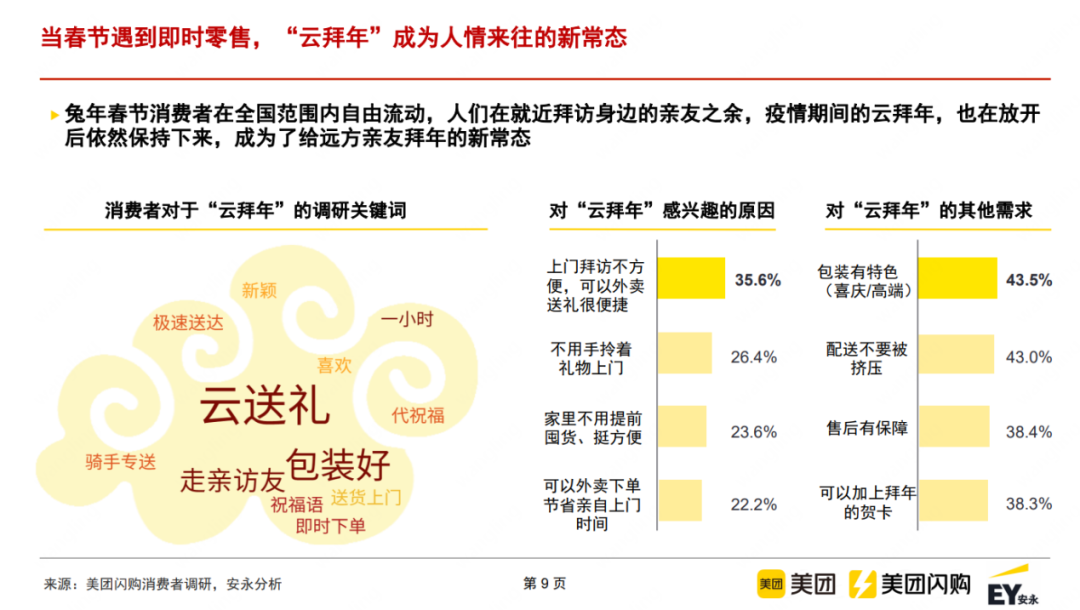 回顾过往几年,出于工作忙碌没时间、电商平台发展快等原因,年轻人越来越少逛超市的声音不绝于耳,他们希望想要就要,对购物效率提出了更高的要求。埃森哲《聚焦中国95后消费群体》报告显示,95后比千禧一代更看重配送速度,超过50%的95后消费者,希望能当天甚至半天就收到商品,还有7%的消费者希望在两小时内收到商品。“2023年美团闪购年货节的95后交易用户数同比增加25%,交易额同比提高41%。”新鲜出炉的《2023新春消费洞察报告》数据也印证了这一点。“过节回家的时候,我在美团给家里买了几箱奶、两瓶红酒,还有零食礼盒,考虑到如果是我自己去买这些东西,实在拎不动。但外卖小哥可以直接把这些东西送到家门口。”已经两年多没有回家的互联网从业者小梅表示,今年她选择了外卖下单的方式,礼和人同时到家,给父母一个惊喜。龙商网超市周刊研究美团闪购2023年年货节的特点发现:年轻人主导下的年货节,更多消费场景被释放,通过点外卖送礼已经成为年轻一代新的消费潮流。美团闪购数据显示,年货节期间,异地下单“云送礼”的订单同比增长50%,休闲零食礼盒类销售同比增长202%,水果礼盒销售同比增长190%,海鲜水产、预制菜等品类也在年夜饭场景下实现爆发式增长。这些需求带来的销售转化,正是由商超、便利店等各业态的实体商家完成承接。在日渐火热的即时零售赛道,前端是海量年轻用户的旺盛需求,中端是满足用户需求的商品供给,后端是即点即达的履约体验。对于在供应链及商品力深耕多年的零售商来说,想要掘金即时零售,还需要具备“前后两端”的能力。即时零售平台则在满足供需匹配方面发挥优势,补齐了两端能力,把不爱逛超市的年轻人,“带回”超市消费。02