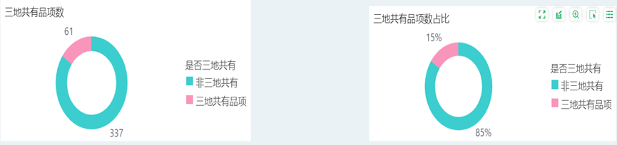 本期三地top200榜单单品共398个单品,其中三地榜单相同单品共61品,占比15.3%。