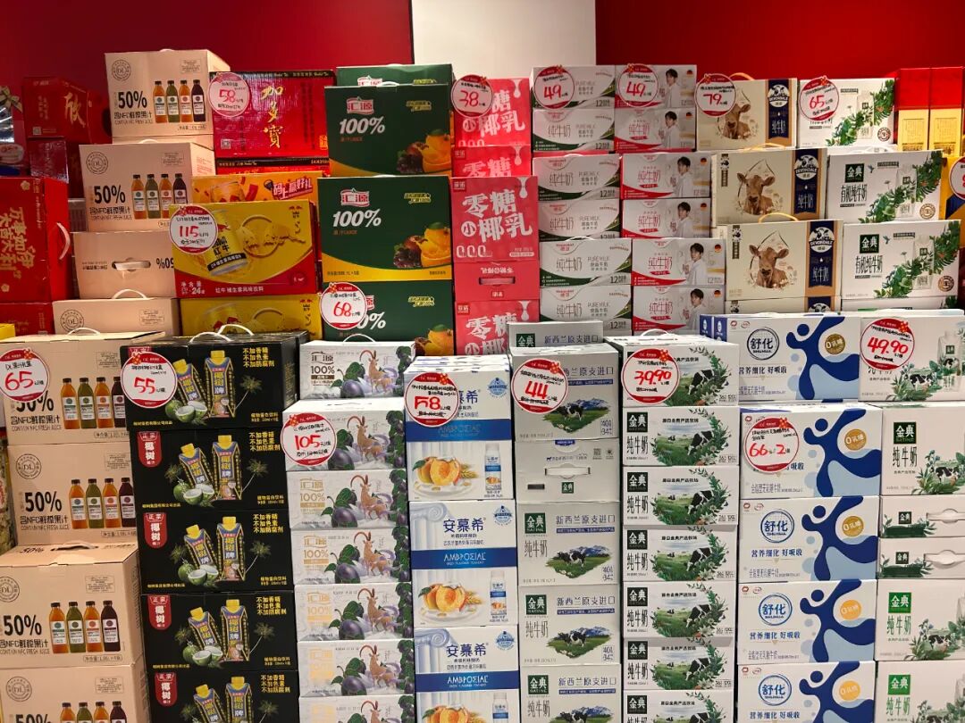 捷森低脂牛奶、伊利舒化奶、德运纯牛奶、德亚脱脂牛奶、菲诺椰乳、汇源果汁、红牛、DL果汁、澳牧儿童成长牛奶······