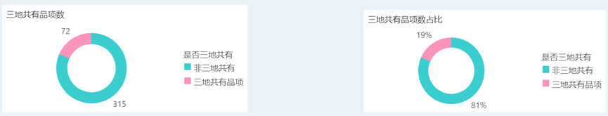 本期三地top200榜单单品共387个单品,其中三地榜单相同单品共72品,占比18.6%。