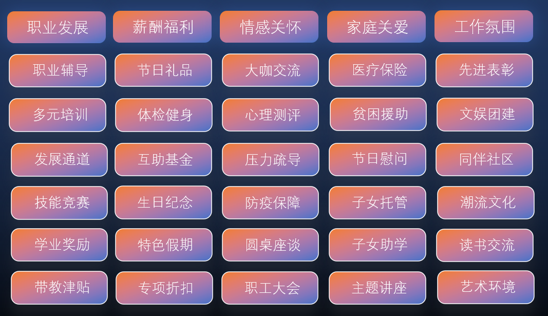 2021年员工年自然流失率对于高管团队,近3年的平均留存率是64%;对于大学生群体,近3年的平均留存率是38.2%。员工流失原因复杂,涉及众多方面。但是不难看出,每一位员工流失的背后,都是企业人力成本的提升。从招聘到培养,凝聚了企业在人力、物力等各方面资源的投入。降低流失率,是企业有效降本的重要措施。结合企业创新实践,协会在研究报告中,也提出两点建议:一是基于数字化应用,关注选人的精准性与培养体系的科学性。招聘阶段把好人才入口,基于岗位画像开展相应的人才测评,提高人岗匹配度。在培养阶段,推行手把手带教,如师徒制或导师制,强化与实践结合的经验传承。美宜佳在学徒制方面的探索具有较好的借鉴价值,针对培训课程无法覆盖的部分,通过建立标准化的带教流程、评价标准等,激发带教热情,提升人才培养效果。重视轮岗机制,从岗位实际需求出发,结合业务发展制定人才储备计划,避免大而全,聚焦岗位实际,科学设计人员轮岗路径,适当压缩管培生轮岗周期等。汇总分析2022年各企业在“员工关爱”方面提报的30余个案例,覆盖了“职业发展”、“薪酬福利”、“情感关怀”、“家庭关爱”、“工作氛围”五个方面30个具体维度。