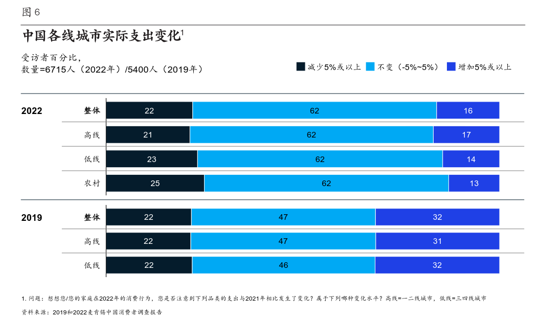 例如,2019~2021年天猫上高端(高端护肤品牌指的是天猫排名前400、商品平均售价超过500元人民币的品牌)护肤品牌的年复合增长率达到52%,是大众品牌的两倍有余, 后者仅为16%(来源:百观科技)。事实上,高收入消费者的花钱意愿也更为强烈:26%的这类受访者向我们表示,他们2022年的消费超过去年,但这一比例依然低于三年前的36%;只有14%的受访者削减了消费,在2019年这一比例为18%。在2019年,两个群体的开支差异不大,但随着较低收入消费者减少开销,2022年的情况开始出现分化(图5)。高收入消费者几乎在所有快消品品类上的支出都不减反增。例如,37%的受访者准备增加洋酒支出,35%打算增加运动饮料支出,32%计划增加果汁支出。高收入受访者表示,他们正在经历消费升级,在提升颜值(如护肤品)和改善体验(如低度风味酒饮)等品类上,会青睐价格更高的品牌和产品。# 消费者转向价格更具竞争力的渠道,更积极地寻求折扣和促销我们的研究表明,尽管消费者的整体支出趋于保守,但他们也通过一些调整来维持自己的生活品质(图6)。2022年,自称支出同比增长5%或以上的受访者比例为16%,较 2019年减半;22%的受访者自称减少了支出。市场起伏波动,促使消费者通过 更严格的取舍来维持生活质量;有的人甚至设法花更少的钱,买 更多的产品。高收入群体正在降低购物频率,或改变在特定品类 的偏好,但并没有转向更便宜的 品牌或产品。这得益于各大品牌(尤其是中国品牌)不断提升自身竞争力,提供了更具差异性的产品。较低收入消费者的应对之道是转向更具价格竞争力的渠道,如通过社区或团购电商平台购买食品和日用品,或选择同一品牌价格更低的产品线。从搜索和购物方式来看,除少数品类外,消费者现在都会进行全渠道购物。另有一些消费者表示,他们会推迟购买计划,等待促销优惠。打折商品比以往任何时候都更司空见惯,价格也更为便宜。以护肤品为例,一些高端品牌在直播间出售入门级产品时,可以通过价格立减和买一送一等促销方式提供近 50%的折扣。# 中国消费者每天平均花费在短视频平台上的时间近两小时麦肯锡在8月进行的全球消费者脉动调研显示,60%的中国消费者每天至少会在头部音频/视频流媒体平台互动一次,每天平均花费在短视频平台上的时间近两小时。凭借数量庞大的月活用户(2021 年抖音月活用户达到6.71亿)(来源:QuestMobile 贵士信息科技),抖音等平台不仅成为突飞猛进的社交媒体平台,同时也是重要的购物渠道。2021年,抖音的总交易额 (GMV)较2020年增长80%,达 8300亿元人民币。护肤品、服装等诸多品类的涨幅逾200%(来源:百观科技)。抖音电商之所以广受中国消费者欢迎,是因为其基于用户兴趣的推荐算法,能激发用户潜在购物欲望,缩短购物决策旅程,从而更高效地完成购物转化链路。此外,抖音还提供更具互动性的用户体验,因而更适合新品发布和测试。虽然明星作为关键意见领袖 (KOL)的时代尚未落幕,但随着中国消费者渴望更细致地了解产品的特性和功能,专注于提供专业化产品信息的“垂直KOL”越来越受欢迎。# 相较于情感因素,消费者在制定购买决策时越来越看重品质和功能中国消费者购买产品时变得越发精明。2022年,作为中国消费者购买快消品时最看重的因素,“功能”不仅重新夺回了2015~2019年 被“情感”抢走的失地,还进一步扩大了领先优势(图7)。从面霜配 方到心仪羽绒服的填充类型及品质,中国消费者对其所购产品的特性和规格了如指掌。在服装行业,功能趋势体现为新的专业化、场合化服装。那些出售所谓“effortless”(无感) 文胸或防晒服的品牌,都实现了强劲的销售增长。一些对市场反应更为敏捷的品牌则适时推出小众户外产品,针对豪华露营(glamping)或滑雪等场景,将高品质的设计与功能融为一体。虽然消费者的信心和支出可能会继续随着宏观经济环境的变化而波动,但中国消费者在研究和购买产品时的要求会日益严苛,这已是一个毋庸置疑的趋势。# 中国消费者选择本土品牌,主要是出于对其品质和创新的认可,而不仅仅是因为低价和民族自豪感调研显示,49%的中国消费者认为本土品牌相较国外品牌“品质更好”,23%的中国消费者则持相反意见。该调研涉及12个不同的产品属性,数据结果都大致相同。在另一份调研中,“高品质”是促使消费者选择中国品牌第三重要的原因,仅次于性价比和支持本土企业,创新则位列第五(中国社科院、抖音和Ocean Engine报告)。简而言之,中国消费者不太在乎品牌来自哪里,而更关心它能提供哪些益处和功能。正是这种倾向,使得消费者在过去几年增加了本土品牌购买量(图8)。例如,虽然国外品牌在燃油汽车市场占据主导地位,但中国品牌却在电动汽车市场销量遥遥领先。中国品牌的智能电动汽车不仅秉持了一贯的性价比优势,同时在智能网联、自动驾驶等方面的表现 也显著优于传统国际品牌的车型。麦肯锡针对汽车消费者的研究发现,中国品牌在电动汽车领域所获得的消费者认知度远高于传统国际车企在电动汽车领域的认知度。得益于产品优势,中国品牌在家电领域同样表现优异。通过对创新的持续投入,中国品牌占领了超过80%的本土市场份额(资料来源:欧睿国际)。过去五年,某领先企业的研发支出每年增加15%,以助力其在全球市场发布节能产品,收入因此显著增长。例如,在前20大手机品牌中,国产手机的