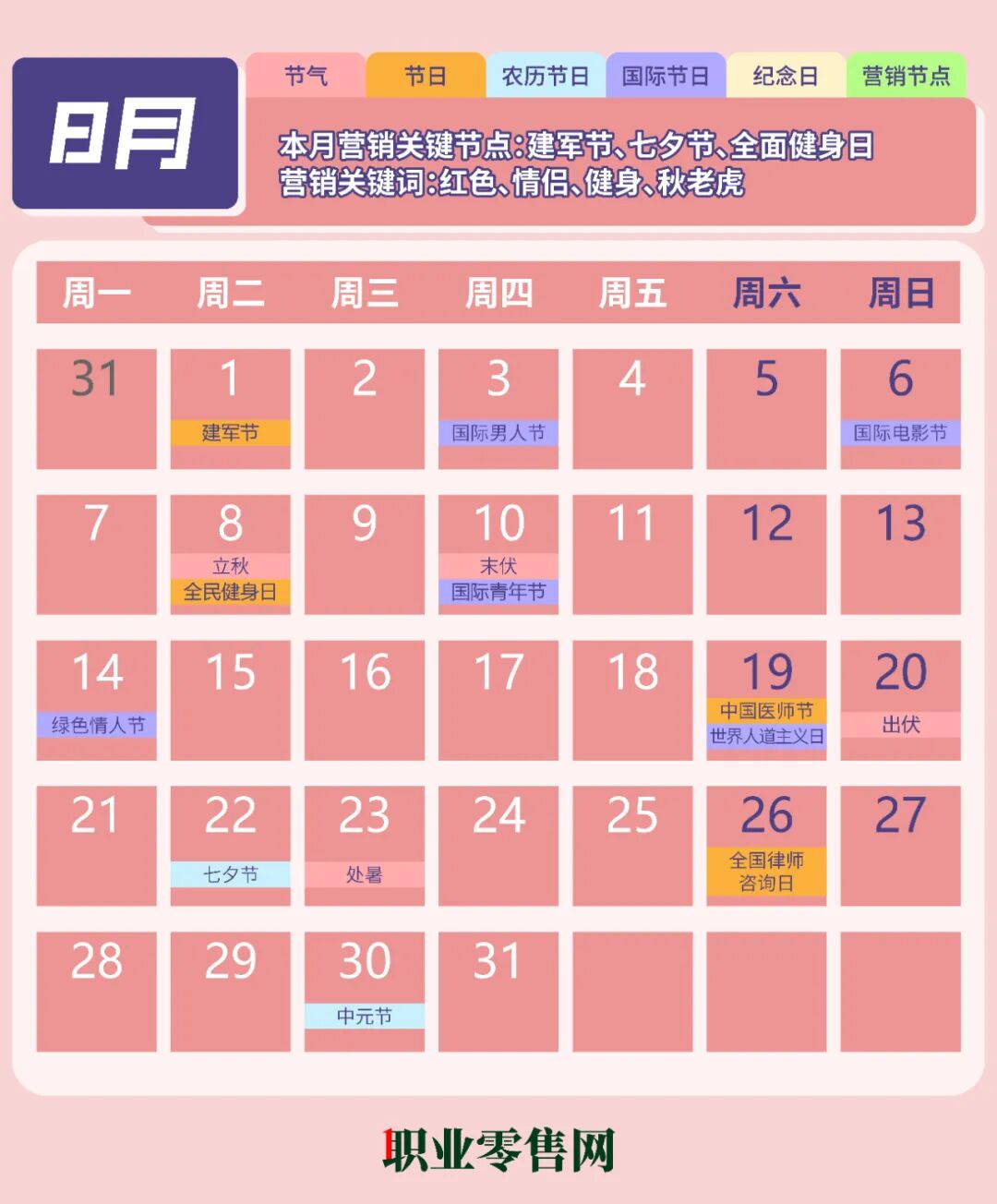 本月营销关键节点:建军节、七夕节、全面健身日 营销关键词:红色、情侣、健身、秋老虎