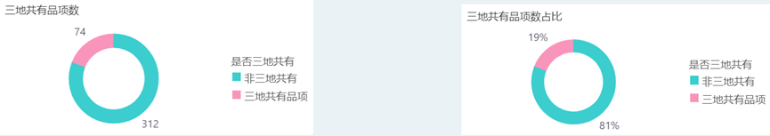 本期三地top200榜单单品共386个单品,其中三地榜单相同单品共74品,占比19.1%。