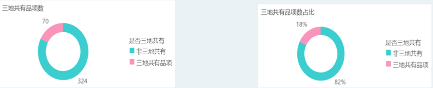 本期三地top200榜单单品共394个单品,其中三地榜单相同单品共70品,占比17.7%。