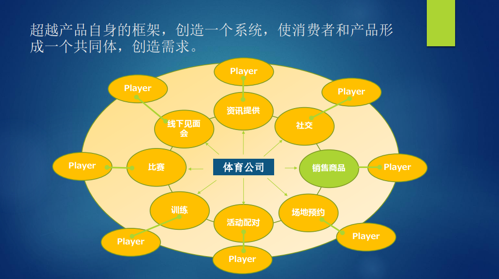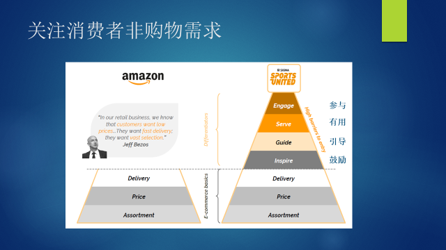 过去我们更多的关注商品我能不能卖出去,卖给谁,聚焦产品本身,我们并没有关注消费者的非购物需求,我这里做了一张PPT,这是我们合作的一家德国公司,是专门从事体育用品网络销售的公司。它主打三款产品,一个是自行车(包括普通自行车和公路赛车);第二个是网球;还有一款是定制球衣。它在做业务的时候和亚马逊做了比较,亚马逊更关注产品的丰富度有多少,价格是不是合适,履约度是不是高。但是完成了这些基本需求的前提下,其实当一个消费者去购买一款自行车,或者是购买一块网球拍的时候,它后面延伸出来的很多需求我们并未关注到。他买球拍肯定想知道更多球拍信息,买了球拍后在哪里用到,请谁教我训练,在哪里找到对手陪我一起玩和参加什么样的活动,等等。所以它更关注的是怎样鼓励买球拍的人玩这个球拍,用这个球拍,怎样使他们买了球拍以后更有用和更多参与。在这一基础上,他们建从顾客需求出发,重建链路。