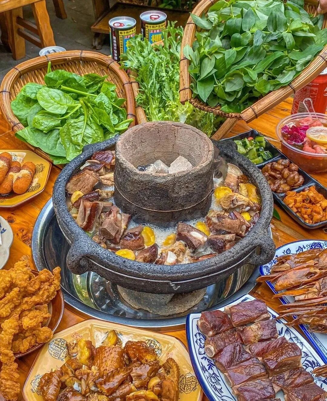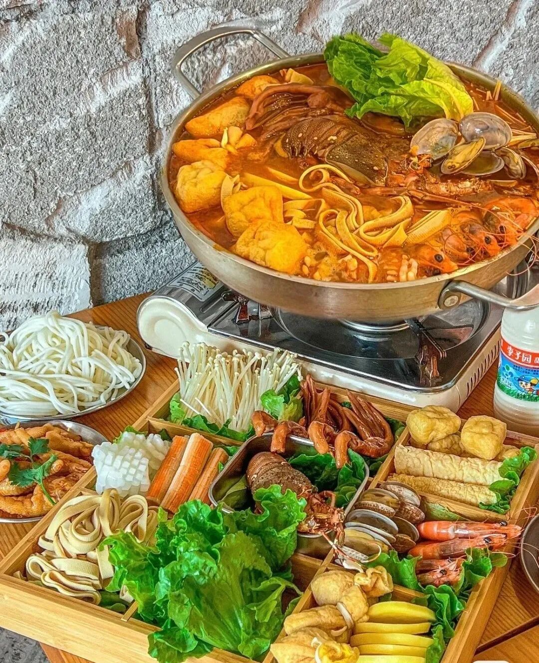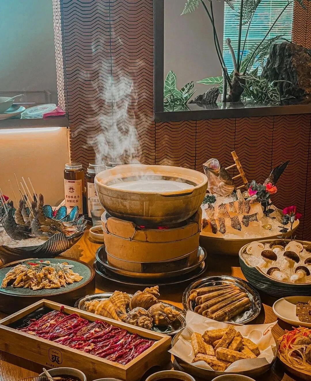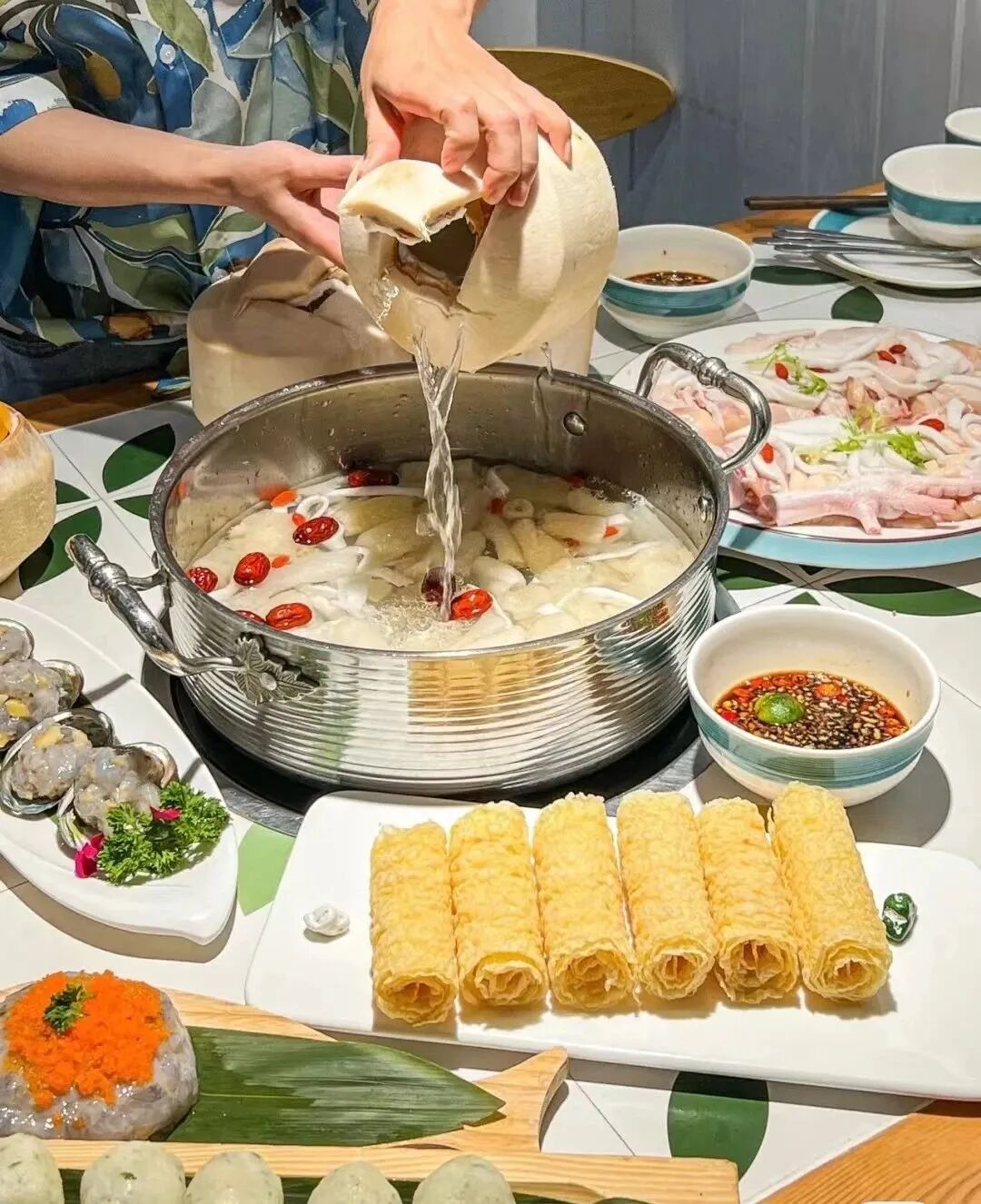 椰子鸡火锅是用椰子水做锅底,配上新鲜宰杀的鸡,十分特别。口味咸鲜,有椰子的清香,汤底久煮不腻,十分清爽,还有益气生津的效果~