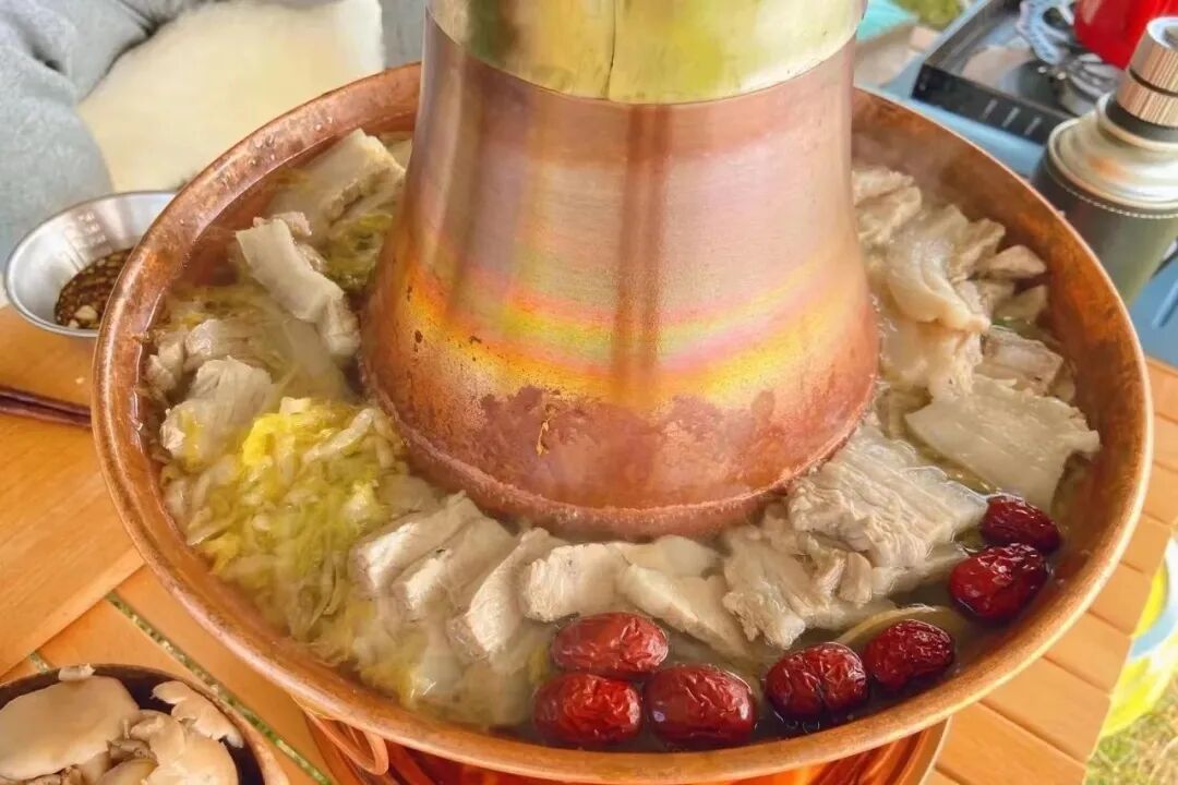“铜锅一盏、清水一碗、姜葱两三”,锅底就是如此简单。清水加葱姜枸杞作锅底,甚至不用放盐,只需要保持高温的清汤迅速烫熟肉片,这样吃才最鲜嫩。