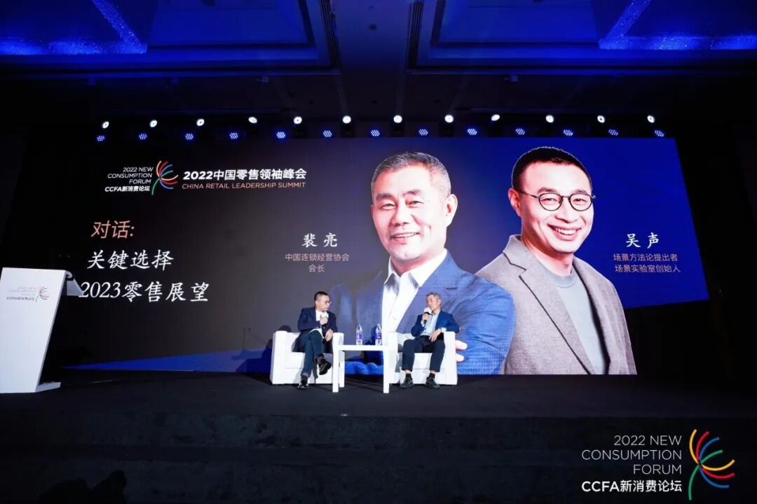 在对话环节,场景实验室创始人吴声作为主持人,与裴亮会长对2023零售业进行展望,并就视频直播、自有品牌开发、人员培训、组织培训、即时零售、大店、小店等行业关注的热点话题进行讨论。