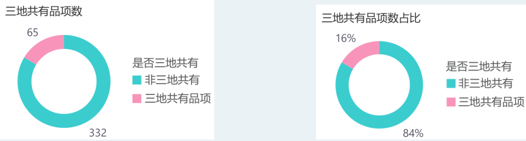 本期三地top200榜单单品共397个单品,其中三地榜单相同单品共65品,占比16%。