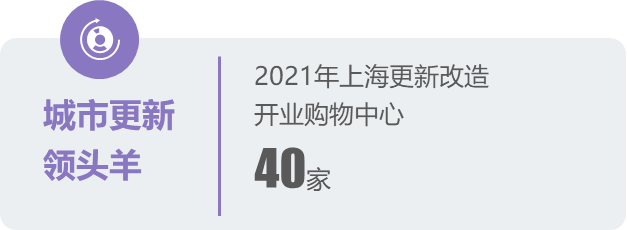 2021年,全国两会将城市更新首次写入政府工作报告。部分城市、地区政府更是提出城市更新项目中的商业规划面积的占比比重需增加,在整个城市更新项目面积占比中商业规划面积占比最高到达了50%,这意味着一半以上的城市更新面积用于商业经营,商业经营因此成为影响城市更新地块发展的重要要素。据不完全统计,2021年上海全年总计开业100多个不同类型的商业综合体,其中包括66个全新增量项目,以及40个存量改造商业项目,购物中心正在成为城市更新的先锋实验基地和客流引擎。小结: