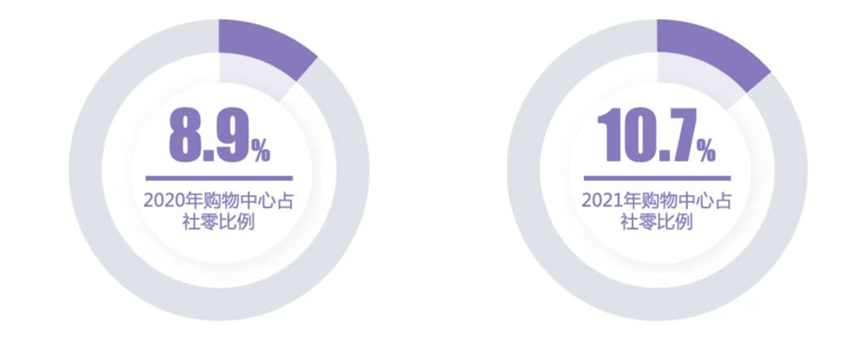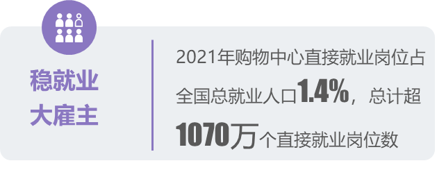 2021年全国购物中心总客流近290亿人次,场日均客流超18500人次,同比2020年增长10%,但相较于正常年份的2019年同比有一定幅度下降。核心城市购物中心业绩平均增长率29%。2021年虽因疫情有所反复,但调研城市的样本购物中心业绩平均增长率29%,直观反映了城市经济发展中,消费端的需求水平是城市具备经济发展活力的最好的表达。 (一)购物中心与国民经济:占全社会商品零售总额超10%2021年,全国购物中心营业总额占同期全国社会商品零售总额10.7%,2020年约占8.9%。其中,上海购物中心营业额占上海社会商品零售总额的12.96%,较上年增加了1.56%。购物中心对促消费、满足人们对美好生活的需求、拉动社会消费品零售总额和GDP有重要贡献。2021年“40强城市”的经济、人口和消费等数据的统计与计算,并结合300个代表性项目经营数据,通过模型推演方法,测算出全国购物中心营业总额约占社会消费品零售总额的10.7%。(二)购物中心与稳就业:提供直接就业岗位近1100万个购物中心具备一个较为完整的“生态系统”,而购物中心全生命周期则是一个内容、结构庞大的产业链。经调研测算,一个建筑面积10万平方米的购物中心可提供直接就业岗位1720个。以购物中心运营管理端统计,提供商业运营管理(含项目招商)岗位约40个,物业管理岗位约80个。如果该项目非三级架构、或有归属的区域公司、或有总部公司提供人员支持,购物中心所提供的就业岗位数量将会更多。以购物中心中营业的各业态的品牌经营端统计,一个10万平方米的购物中心约有300个品牌(含主力店),可提供零售、餐饮、娱乐和服务等相关职能服务岗位约1600个。 当下及未来,服务人员和物业人员数量达行业均值的1.3-1.5倍;在数字化创新领先的购物中心为了运营私域流量,组建更完备的数据支持团队,带动了更多专门性、技术性的就业岗位。作为实体综合商业平台和经营空间,以购物中心产业链条衍生了大量高端人才岗位;在营购物中心外延服务、活动,提供大量服务型就业岗位。
