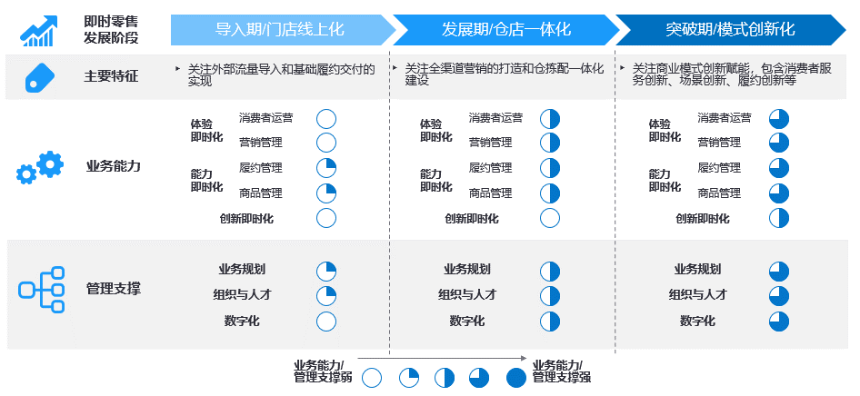 2026年即时零售市场规模将超1万亿元。中国即时零售的市场规模有多大?即时零售增长非常迅速,据估算,2020-2021年,年同比增长率基本保持在80%-100%。在可以预见的未来几年,即时零售市场将会依然保持高速增长。报告调研中,业内人士普遍预测未来几年复合增长率将会在50%左右,行业整体具有强劲的增长动力和巨大的增长空间。预计到2026年底,即时零售行业相关市场规模将超过1万亿元。《报告》分析了即时零售的主要模式。对于即时零售商业模式的分类,业内一般依据是否直接拥有商品将其模式区分为两种:平台模式和自营模式。《报告》对平台模式和自营模式从资产轻重、控货程度,收入来源、盈利模式、配送模式等方面进行了对对比分析。对于各模式下头部的主要玩家进行了介绍。即时零售平台对于线下门店的价值。即时零售是依托于线下实体零售的业务,可以作为对线下实体零售的补充,帮助其拓展销售渠道,有助于线下实体零售实现线上线下相融合。《报告》详细分析了即时零售平台对线下门店的赋能,包括扩大门店覆盖半径,获取新的流量,提升门店运营能力、用户洞察和运营能力等。《报告》还对即时零售的演进路线进行展开分析。将其划分为三个阶段,即导入期、发展期和突破期,指导零售企业在不同阶段如何打造业务能力和应当具备的管理支撑。图:即时零售ACE制胜演进路线