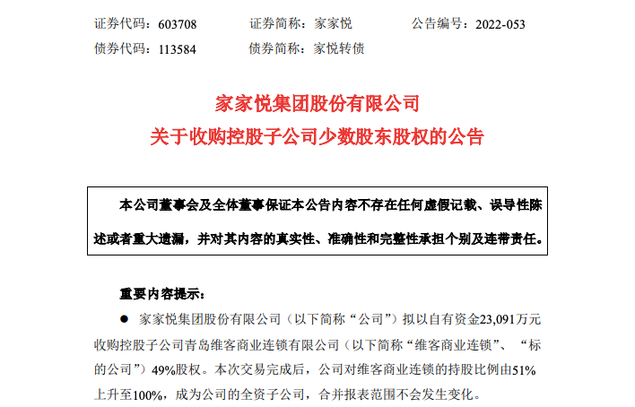 公告显示,本次交易完成后,家家悦对维客商业连锁的持股比例由51%上升至100%,成为家家悦的全资子公司,合并报表范围不会发生变化。