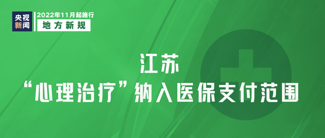 自11月1日起,江苏省将“心理治疗”项目纳入医保支付范围,明确执行三类、二类和一类收费政策的定点医疗机构“心理治疗”项目医保支付标准分别为200元/次、180元/次和160元/次。