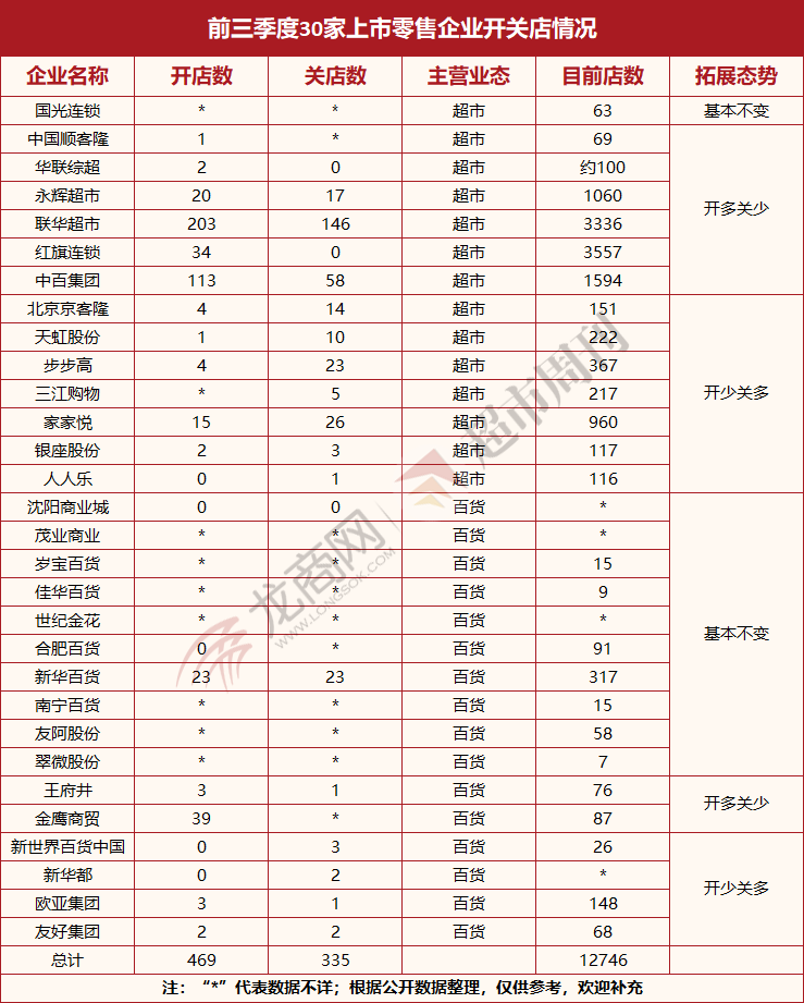 导读:传统大店真没救了吗?龙商网&超市周刊统计显示:前三季度,30家上市零售企业虽然开店总数大于关店,但大量开店集中在个别企业,而