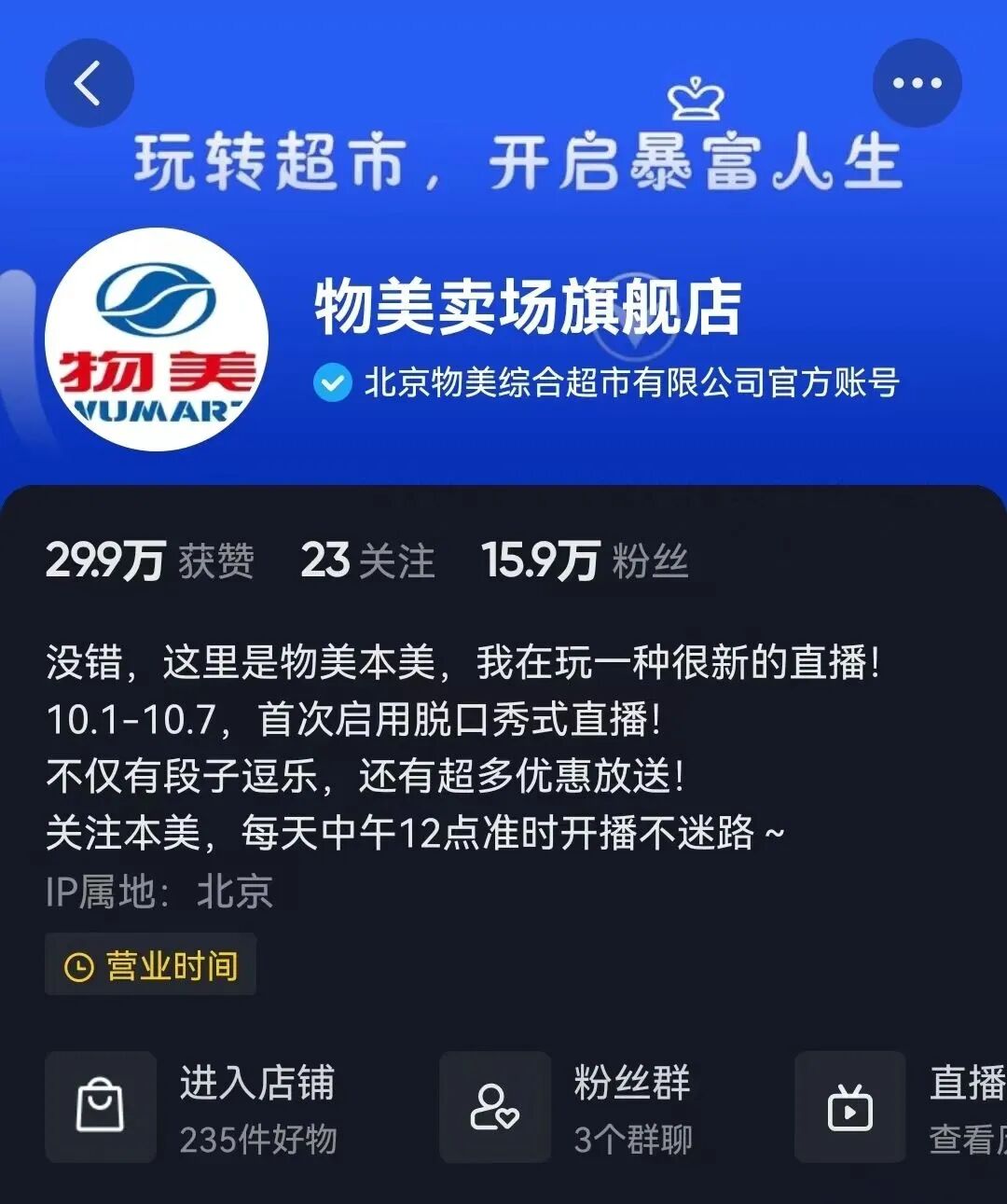 在物美大卖场双井店了解到,物美在该店直播布景,通过抖音平台进行全天6-8小时的直播,从9月16日至今,直播累计销售额超300万元