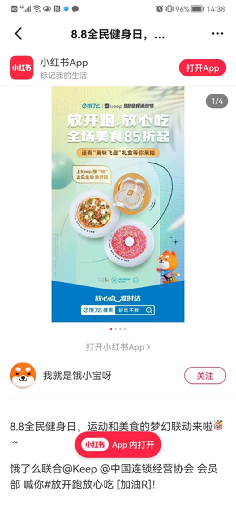 在协会大健康委员会的倡导下,饿了么与“Keep”联合多家餐饮企业共同发起了“好吃不胖”健康餐活动。活动联动的麦当劳、汉堡王、西贝莜面村、左庭右院、云海肴等30余家中西连锁品牌,推出一系列适合运动减脂人群饮食习惯的定制餐品,并结合当夏年轻人爱玩的飞盘运动,一起倡导阳光积极的生活方式,带领大家吃的更健康、更营养。