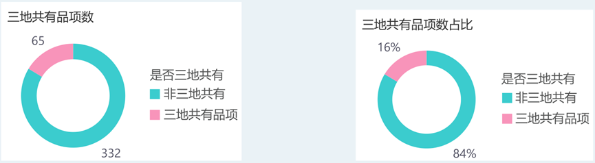 本期三地top200榜单单品共397个单品,其中三地榜单相同单品共65品,占比16.3%。