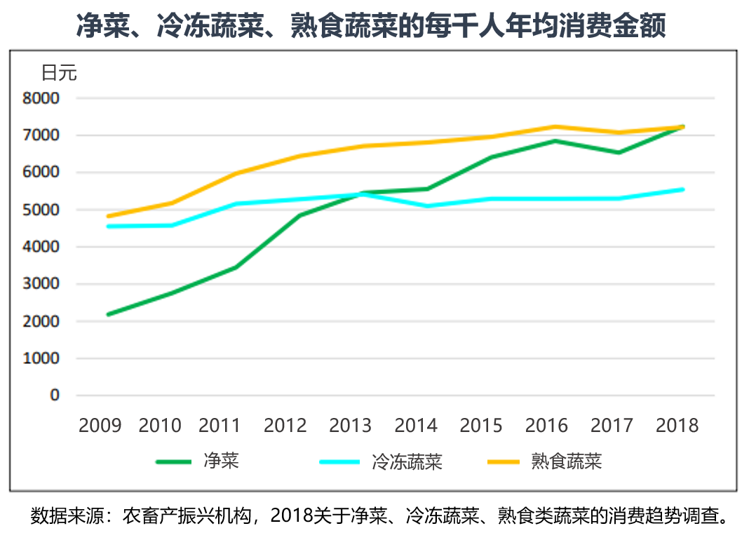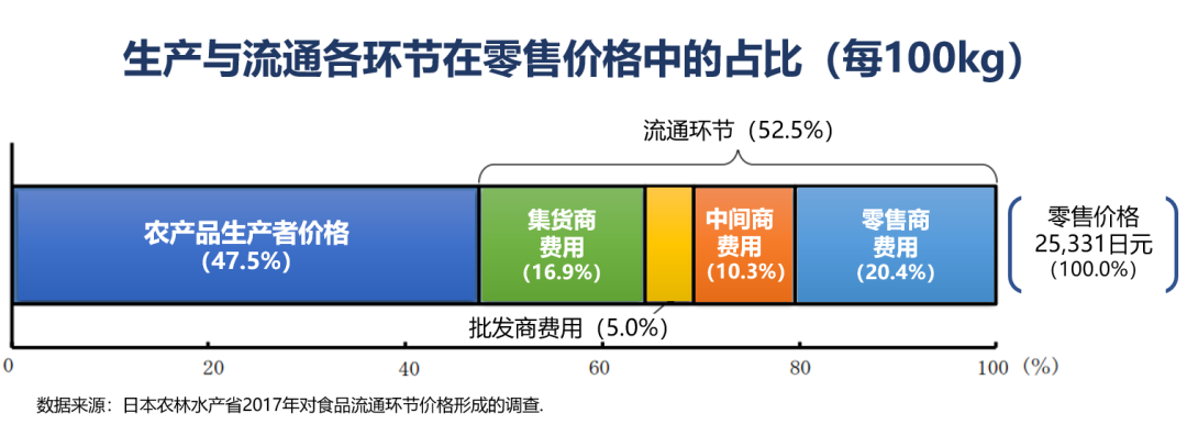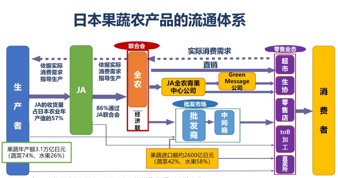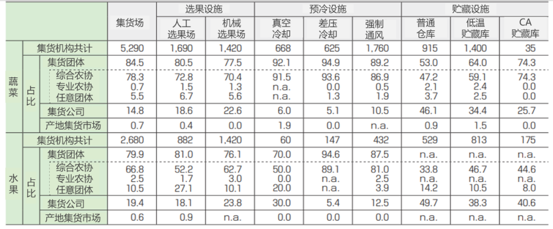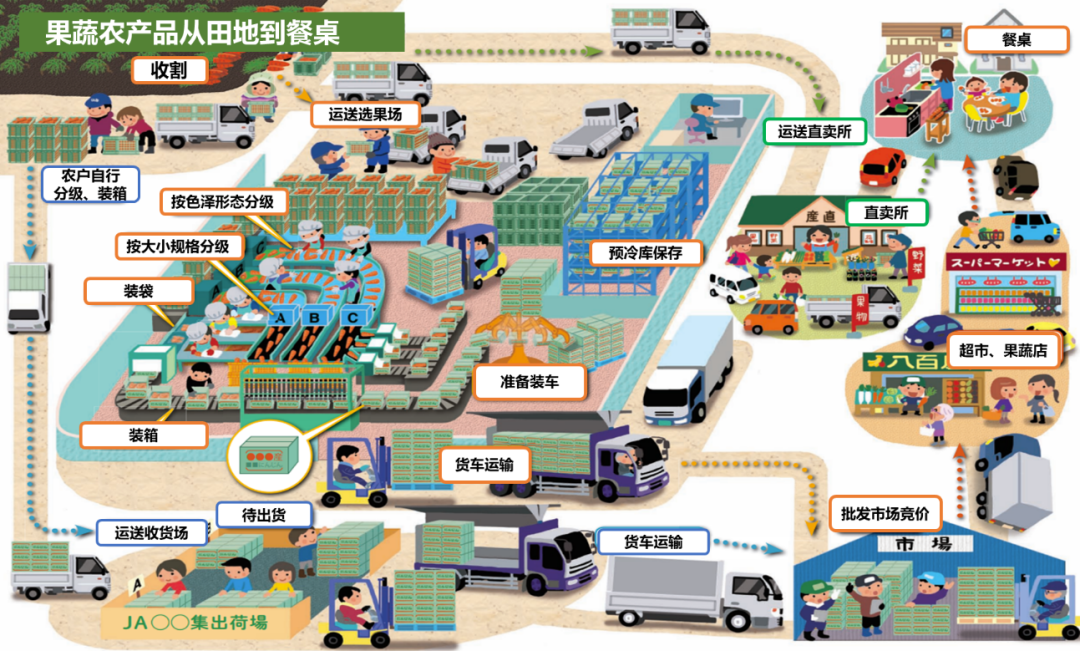 同年度蔬菜的消费量1436万吨,国内产量1147万吨(含出口6万吨),进口量295万吨,蔬菜自给率79.5%。目前日本农林产业省统计的蔬菜品种约有90种左右,包菜、白萝卜、洋葱居国内产量前三位。进口蔬菜以洋葱、土豆为主,多用于冷冻、冻干和罐装食品加工。虽然蔬菜消费量呈下降趋势,但净菜、冷冻蔬菜、熟食蔬菜等加工蔬菜的消费却在逐年增长。其中,以净菜类增长最快。净菜主要包括沙拉、拼盘和鲜切蔬菜。由于单身人群、双薪家庭增加,消费者更愿意选择多种蔬菜搭配好、一餐一包的半成品或即食品。日本农产品的流通体系中,日本农业协同工会(Japan Agricultural Co-operatives,简称JA或农协)起着关键性作用,其每年收货量占农业年产值的57%(2016年数据)。全农(全国农业协同组合联合会)是JA旗下负责经济业务的全国性组织,通过在各地的经济联(经济农业协同组合联合会)开展业务。农产品通过直销、农协旗下的果蔬批发商JA全农青果中心及批发市场等渠道进入零售端。Green Message是JA旗下专营蔬菜加工的子公司。进口果蔬一般不经过JA,而是由商社、贸易公司经批发市场或直接对接零售端。部分地产地销的果蔬,越过中间环节,由农户直接送到超市门店或车站等地的直卖所销售。2017年日本农林产业省对16种重点果蔬在生产和流通各环节的价格进行了统计。按平均每100kg的零售价格25,331日元计算,生产者价格占比47.5%,流通环节费用占比52.5%。流通环节主要包括集货商、批发商、中间商和零售商,分别占比16.9%、5.0%、10.3%、20.4%。16种重点果蔬中,生产者价格最高的是菠菜59.9%,黄瓜57.5%、茄子54.0%紧随其后。流通环节费用占比中,胡萝卜64.5%、洋葱62.5%、土豆60.5%排名前三位。虽然不同品种果蔬的价格体系有所不同,但在中间流通环节中,集货商的费用占比都是最高的。集货商在果蔬农产品的流通中起着关键作用。分布在全国各地的集货设施,是对采摘后的农产品进行分级(日语称“选果”)、预冷及贮藏的场所,也是实现果蔬标准化、保鲜存储,并提升流通效率的重要环节。日本农林产业省2006年的调查显示,全国共有蔬菜集货场5290处、水果集货场2680处(含重复计算)。其运营主体包括集货团体、集货公司和产地集货市场。其中,综合农协的占比最高。通常集货场内设有选果、预冷和贮藏等设施。从1965年引进第一台预冷设备开始,日本就开始了对果蔬流通基础设施的投入,直至90年代逐步确立了果蔬全程冷链管理体系,确保果蔬品质,并实现标准化。日本果蔬集货设施的数量与各机构占比