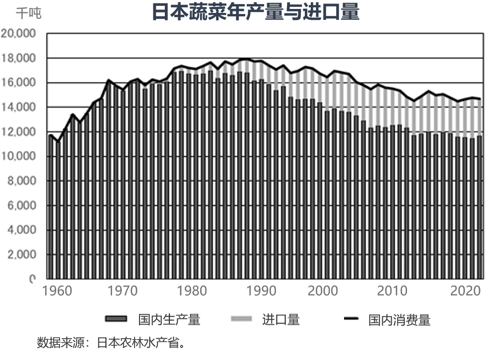 1960至70年代,日本果蔬在人口增长、需求扩大及栽培技术提升等背景下,年产量呈增长态势。然而,进入80年代后,受农业从业人口老龄化、劳动力短缺及饮食需求变化的影响,果蔬年产量在1980年前后达到高峰后开始下降,同时进口量逐年增长。进入2000年代后,由于消费市场整体萎缩,果蔬的消费量呈现下降趋势。2020年度,蔬果的年产值约为3.1万亿日元,其中蔬菜2.3万亿日元、水果8000亿日元。水果的消费量711万吨,国内产量269万吨(含出口6万吨),进口量449万吨,水果自给率仅36.8%。日本国产水果以苹果和蜜柑为主,进口量和消费量最大的水果是香蕉。![]()