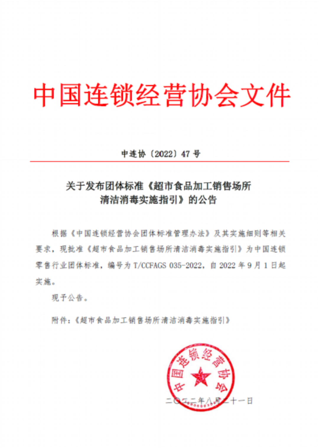 为此,中国连锁经营协会(CCFA)食品安全工作委员会根据当前主要超市企业的经营管理标准和现状,联合艺康中国、北京超市发、麦德龙、永旺、大润发、沃尔玛、永辉、天虹、家家悦、京东七鲜、明康汇等各类型超市企业提出并制定了团体标准《超市食品加工销售场所清洁消毒实施指引》(T/CCFAGS 035-2022,以下简称《指引》)。《指引》已对外发布,于9月1日起实施。