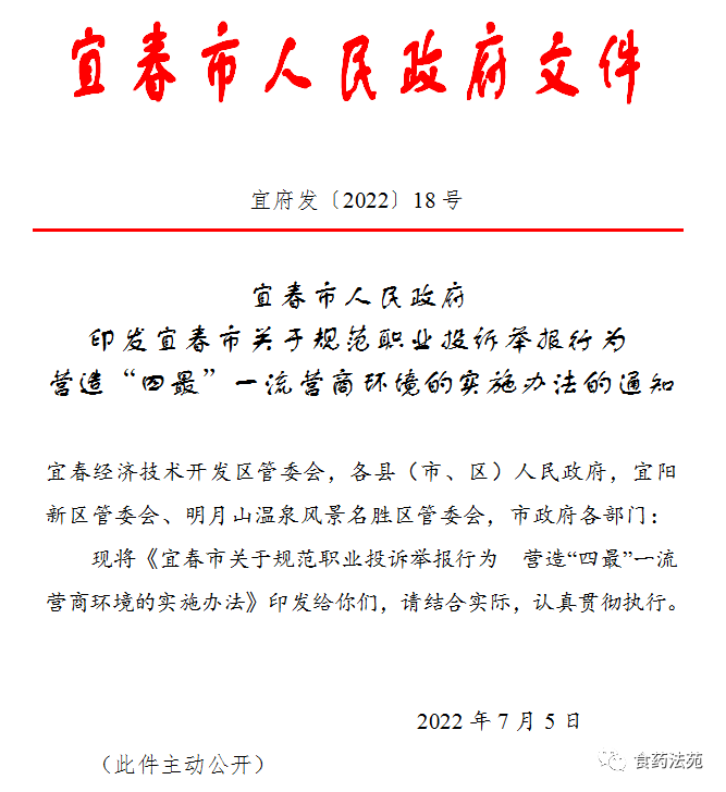 近日,江西省宜春市人民政府出台《宜春市关于规范职业投诉举报行为 营造“四最”一流营商环境的实施办法》(以下简称《办法》),成为全国首份以设区市人民政府名义出台的规范职业投诉举报行为的行政规范性文件。