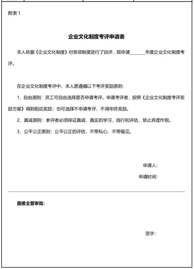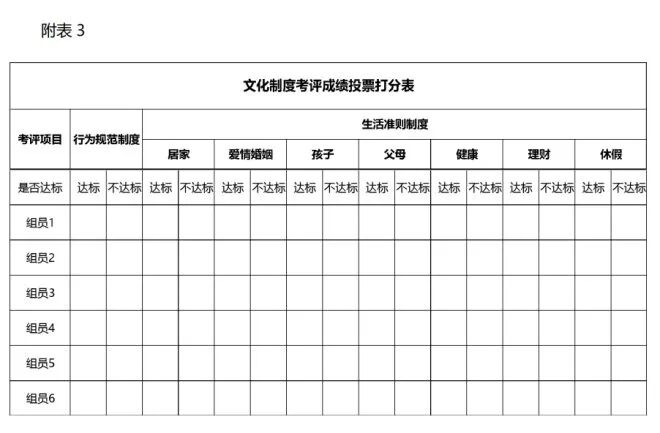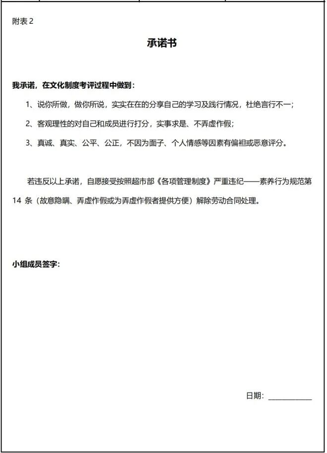 在刚刚结束的2022联商网大会上,东来哥表示,胖东来的成功秘诀在于“道”,而不在“术”。学习胖东来关键要学会胖东来的“道”,也就是企业文化。东来哥强调,我们都要为幸福而活,为美好而活,活得有尊严,走出功利,走向人性。胖东来的理念也是让人活的健康,活的阳光,活的个性,活的独立,活的自由,活的美丽。更为关键的是,胖东来的理念不是说的,也不是随便写的,而是知行合一。7月20日,胖东来更新完善了针对员工行为规范、生活规划的企业文化制度。同时,为了鼓励员工在思想、工作、生活等方面,积极主动的践行企业文化制度,7月25日,胖东来超市部制定了《企业文化制度考评奖励方案》,以期用理性的方法引导大家进步和改变,真正让大家在做的过程中越来越有感受,体会到先进的理念会给自己的生活带来更多轻松、快乐、甜蜜和幸福!思、知、行合一,从而培养健全的人格,成就阳光个性的生命状态。以下是针对员工生活的《胖东来企业文化制度》以及胖东来超市部发布的《企业文化制度考评奖励方案》,供行业同仁参考借鉴。1、先进性:基于当下社会文化环境及普遍生活状态,结合中西方先进的文化理念逐步推进及践行,创建更加健康、文明的企业氛围及行为标准,让全员生活状态、生命品质往自由、轻松、阳光、个性、幸福的方向上进步;2、引导性:每条制度的建设以“培养健全的人格、成就阳光个性的生命”为核心,具有对全员思维及行为的引导性;第一章、行为规范制度(违反行为规范制度中任意一项,视为违背企业文化理念,取消全年奖励)3、禁止在工作中掺杂偏见和私心,不公平公正,偏袒、包庇、纵容他人9、禁止通过语言暴力进行人身攻击或把人身攻击视为调侃11、禁止给他人制造精神压力和精神包袱,带来紧迫感12、禁止家庭暴力(辱骂、殴打、虐待、冷暴力等伤害性行为)13、禁止把机动车借给家庭之外人员使用,或借用他人车辆14、不允许相互借钱(如有紧急情况,按照流程向公司申请)15、禁止炒股、投资、理财、担保、放贷、借贷等高利或高风险行为20、女员工禁止夜间在偏僻人少区域着装暴露(超短裙、低胸衣等)22、禁止恶意发布或跟风转发不实信息,造成不良后果第二章、生活准则制度(违反模块中的任意一项,取消该模块相应比例的奖励)2、禁止租赁位置偏远、存在用电、消防安全隐患的住所3、家庭消防器材配备齐全、并可正常使用,保证家庭成员能够正确操作4、用标签清晰标注家用电器设备的使用年限、到期日期,不超龄使用5、晚上10点至早上6点之间禁止地板发出噪音影响他人7、家门口禁止长时间堆放生活垃圾,及时下楼放入垃圾桶6、禁止束缚对方,不以孩子或其它原因强迫、威胁对方7、离婚或分手后禁止纠缠对方、给对方造成精神困扰或身体伤害8、禁止因家庭矛盾、夫妻矛盾对彼此造成长期消极、烦闷、痛苦等不良影响9、婚前体检,不隐瞒身体健康问题,为自己和爱人负责2、禁止以成绩为导向评价和教育孩子,不允许孩子分数不好时批评、否定、指责6、禁止干涉成年子女自由恋爱和婚姻,或以挑剔、恶劣的态度对待孩子的恋爱对象7、拒绝父母“自我牺牲”式的付出,禁止使用“都是为了你好”、“要不是为了你”、“我 辛辛苦苦把你养大”等语言教育孩子9、禁止过分追问私人问题、翻看孩子日记、窥探孩子隐私等10、子女20岁以后独立生存,父母不向孩子提供生活费用(在孩子能够支付房租和满足生存之前,允许孩子暂时通过借款形式进行资助)11、对于家庭两个孩子及以上的,要给予每个孩子平等的爱、不偏心3、禁止盲目顺从父母,对父母在家庭关系中不正确的思想和行为及时制止和沟通引导2、禁止将情绪转移到他人身上,故意不尊重、伤害他人3、禁止让自己沉浸于自我谴责、自我抨击或愧疚、罪恶感中5、体重指数BMI在18~27.9范围内,超出健康范围的不能继续增长7、为自己及家人购买大病险(不在购买范围的人员购买医疗险)1、禁止套用信用卡(超出自己偿还能力或为自己、他人获利)2、禁止提供个人身份证给他人使用,谨防被套用征信用于贷款、担保、抵押等5、给予双方父母、家人、亲戚等的照顾,禁止超过收入的20%1、长途旅行购买旅行保险、意外保险,保额不低于50万(处级不低于200万,店级不低于500万)3、禁止出现不文明现象(乱涂乱画、语言粗狂、破坏花草树木、乱扔垃圾等)6、车辆无人看管时,禁止将行李、包等贵重物品放在车内7、禁止到存在安全隐患的景点游玩(无信号、迷失方向、野兽出没)1、自由原则:员工可自由选择是否申请考评。申请考评者,根据考评结果得到相应奖励;也可选择不申请考评、不得年终奖励。2、真诚原则:参评者必须保证真诚、真实的学习、践行和评估,禁止弄虚作假。3、公平公正原则:公平公正的评估,不带私心、不带偏见。日常发现违反行为规范制度中任意一项,视为违背企业文化理念,取消全年奖励;发现违反生活准则制度模块中的任意一项,取消该模块相应比例的奖励。1、逐级提交申请:个人填写《企业文化制度考评申请表》(附表1)提交直接主管(1)各部门逐级组织提交申请考评的人员进行随机分组,每组不超过6个人,各小组自行安排考评时间、考评地点:A.店长组织本店管理层逐级考评(不含店长),课长组织本课员工考评A.每个成员需提前填写好“文化制度自评打分