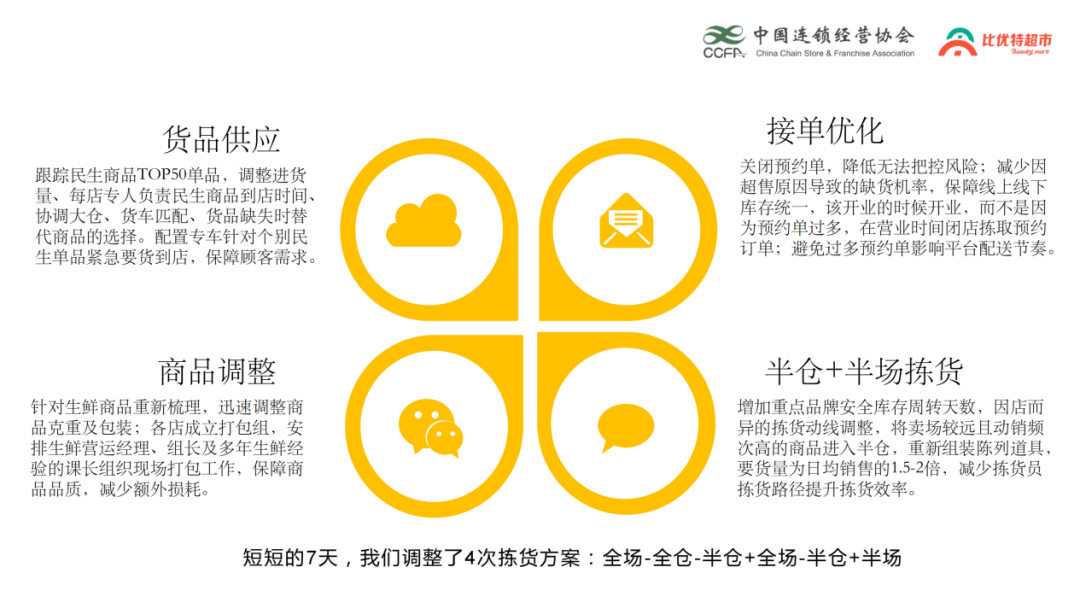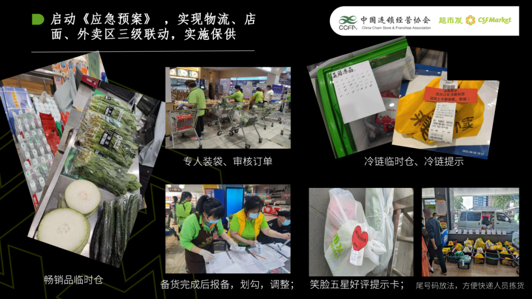 在各项举措的综合作用下,零售商超与美团闪购的合作取得了较好的成果——北京超市发,该超市作为北京疫情防控期间的保供企业之一,在这场抗疫战中发挥着重要作用。北京超市发特殊渠道负责人连玉颖从人员调配,物流、店面、外卖区三级联动,平台紧密合作,私域流量打造等方面分享了作为零售企业的应对经验。面对疫情挑战,北京超市发打破常规,实施人员的统一调配,坚守“营盘”在公司层面,超市发工作人员受防控措施限制,面临到岗率不高等问题;超市发立即作出调整,实施一人多岗,即从原来以连锁店为单位的管理、连锁店层面以部组为单位的管理,进行全部打破重组,将超市发作为一个整体,所有人员统一调配。对于疫情防控期间生鲜食材等商品,高于平时3-5倍的订单量,对应生鲜配送人员、采购人员全员满负荷24小时连轴转,保证各类蔬果等快速配送到店。在连锁店层面,则采取落实线上责任人制度,实施一人多职,对客诉、履约、顾客评价等进行专人盯岗,既是值班经理、客服人员也是外卖负责人,同时根据订单量统一协调各部组人员进行拣货,实施“尾号拣货法”,有效对各分拣小组工作效率、效果进行跟踪,提高拣货质量。与此同时,北京超市发启动应急预案,实现物流、店面、外卖区三级联动。首先,公司启动防疫物资保障应急预案,对顾客可能购买的米、面、油、蛋、菜等品类加大储存;配送中心开通了绿色通道,确保第一时间入库,开启全天候的配送,确保粮油可销天数在40天,根茎菜可销天数为10天,方便面可销天数为30天;配送中心制定了果菜应急蔬菜包,统一配送到门店,减轻门店的拣货压力。其次,根据顾客到店情况,提前半小时营业,延长营业时间,晚上直到顾客离店后自然闭店;各连锁店采取大店带小店形式互相调配人员、商品、确保全系统全力保证供应。最后,在外卖区,超市发对线上畅销商品,提前囤至外卖区;外卖区设置线上冷链储备临时仓,对速冻商品张贴“冰品提示卡”;调整卖场布局,扩大外卖区范围,对各平台待发货物分区管理,实施“尾号码放法”方便配送人员快速找到对应商品;并通过笑脸卡,拉近与顾客的距离;更为关键的是,北京超市发联手平台,动态调整货场边界。这打破了传统商圈范围,以顾客买得到、顾客体验好为前提重新调整电子围栏。比如基于大店的产品丰富、人员多、服务能跟得上,实施大店配送范围覆盖小店商圈。还通过社群传播、网红种草、盘活私域流量,打通线上线下。顾客群建立了新的链接,满足线上下单配货到家;在顾客群互动,将性价比高的产品通过菜谱、种草的形式展示给顾客,激发购买欲望;同时将线上活动通过微信群、朋友圈进行推广,扩大宣传,吸引客流。