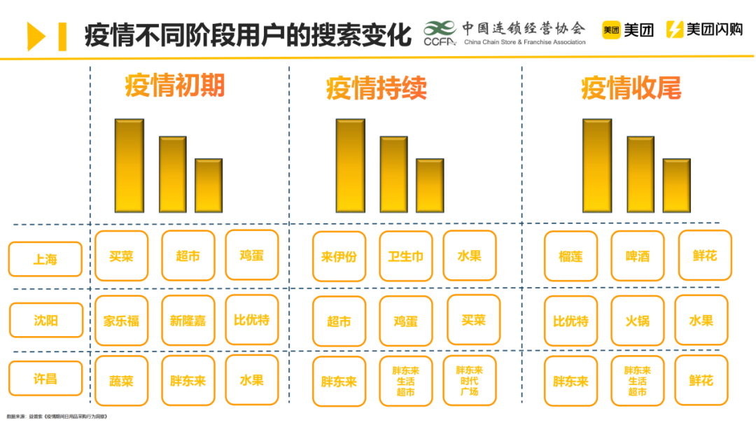 疫情防控期间,消费习惯的变化呈现出线上化、健康化趋势,这也导致消费需求随之发生改变。特别是在疫情防控形势相对严峻的城市,消费者对基础物资保障的需求爆发,也对零售企业组织供应链、对必需物资的保障能力提出更高要求。同时,外卖平台也要能够更快速、更稳定的进行履约,保证人们的生活所需。在这个过程当中,美团闪购作为即时零售平台之一,无论是在商品、履约以及运营能力上,进行了一定的积累与迭代,持续参与到各地疫情应对当中,与冲在保供一线的零售企业一起并肩作战。 通过平台数据我们可以发现,在疫情的不同阶段,消费需求也呈现出不同变化。疫情初始,用户搜索关键词集中在买菜、超市、鸡蛋等;随着疫情防控进展,用户放松性、解压性需求开始增加,日常消耗品开始逐渐成为主要需求——来伊份、水果、卫生巾等商品占据用户搜索的主要热度;而在收尾阶段,包括榴莲、啤酒、鲜花等进一步满足生活质量的商品占据需求主流。通过美团闪购平台的用户搜索发现,不同场景下新的消费需求也在产生,如居家办公场景下,用户搜索耳机、电脑、数据线、按摩垫等与办公有关的东西逐渐增多。可以看出,疫情下的到家需求已经成为刚需,线上平台与零售商超的紧密合作,不仅能在疫情常态化防控中切实满足人们的物质需求,同时也能帮助零售商超企业获得新的生意机会。与此同时,作为保供平台之一的美团闪购,在疫情防控中持续积极响应需求,搭建线上保供专场、专题,启动应急机制,持续与零售商超企业一起助力各城市的抗疫保供。将与商超合作伙伴的值得信赖的优质商品和服务持续向用户透传,获得用户认可。例如在疫情伊始阶段,平台快速启动应急机制,搭建“保供专区”会场,设置防疫保供物资专区,方便用户快速下单;同时,在订单压力较大的情况,组织骑手支援商超门店,保障民生订单的履约能力。疫情防控阶段,由于小区封控,在许多用户因疫情出行不便的情况下,美团闪购快速调整策略,利用线上弹窗提醒用户“保障供应、安心选购”,并通过平台消息推送,对区域内消费者进行告知,在线营业能让消费者放心、安心;同时启动疫情应对机制,平台管理+客户体验并行,比如对商品的价格、商品缺货情况以及用户的体验进行管理。而在疫情封控时期,城区进入静默状态,美团平台积极配合政府要求,做好民生保供任务的承接;结合商家情况提供疫情专属套餐展示途径,专区专售;同时升级应对机制,加大客服力量投入,满足用户需求,保证用户体验。在配送模式上,也根据当地管理要求,推出批次配送、次日达模式, 用三轮电瓶车、厢式货车等载具增加运力,有效保障了订单的履约能力。