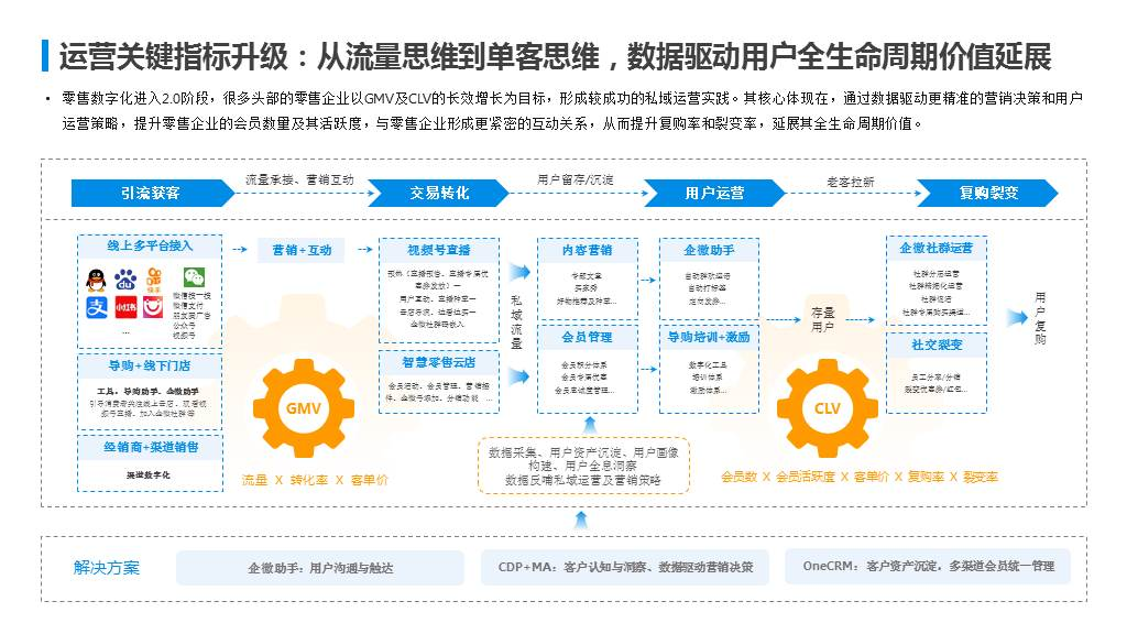 报告最后指出,受流量红利退却、获客成本增加等因素影响,以规模化获客并实现销售转化、从而带动GMV增长的传统营销模式变得更加困难,因此零售企业的“运营关键指标”也在发生变化,由流量思维转型到单客思维,数据驱动用户全生命周期价值延展,即专注每一位既有用户的生命周期价值(CLV)。2.0阶段,零售企业更加关注会员数、会员活跃度、客单价、复购率、裂变率等核心指标。