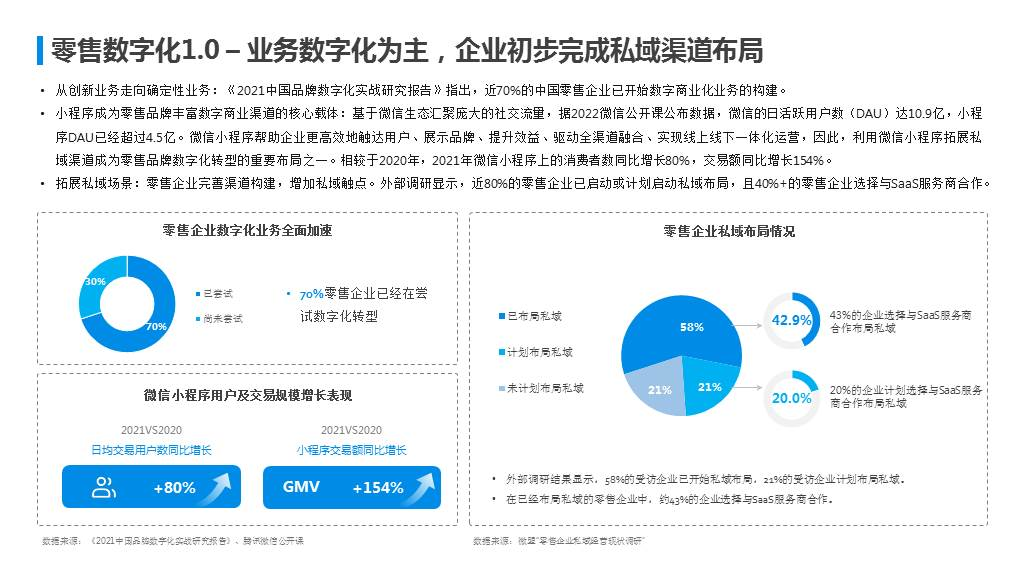 与此同时,在流量红利见顶、拉新获客成本高企的情况下,“私域”成为品牌在布局数字商业时性价比较高的选择。《报告》数据显示,58%的受访企业已开始布局私域,21%的受访企业计划布局私域。在已经布局私域的零售企业中,约43%的企业选择与SaaS服务商合作。