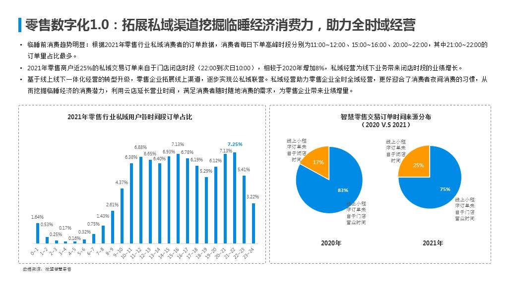 基于此,《报告》指出,通过私域渠道拓展业绩增量是零售数字化1.0时代的私域的主要价值。根据《报告》数据,2021年零售行业私域用户各时间段订单占比数据显示,近25%的私域交易订单来自于门店闭店时段(22:00到次日10:00),该数相较于2020年提升8个百分点。